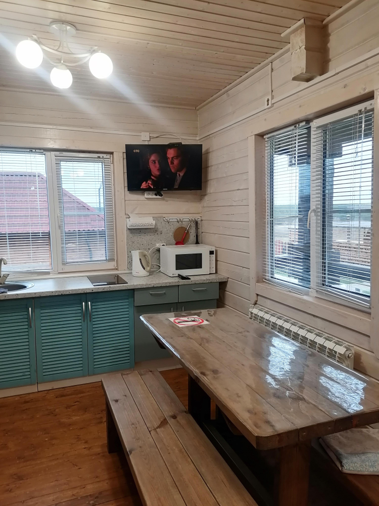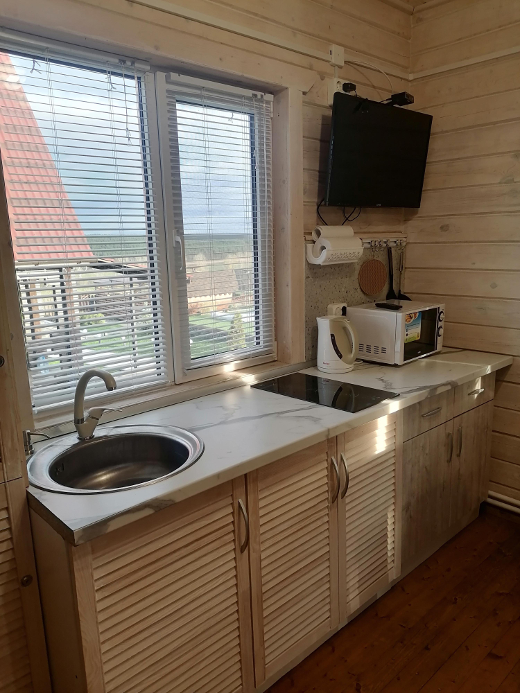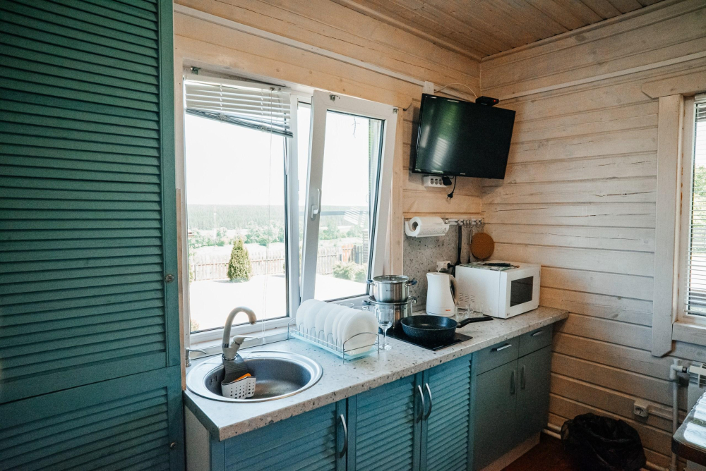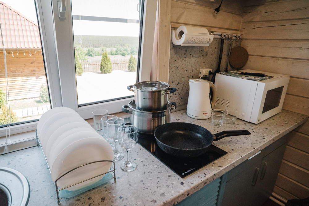 - Кухня: холодильник, микроволновка, плита, чайник, посуда