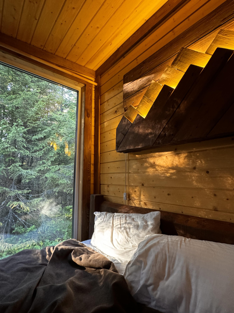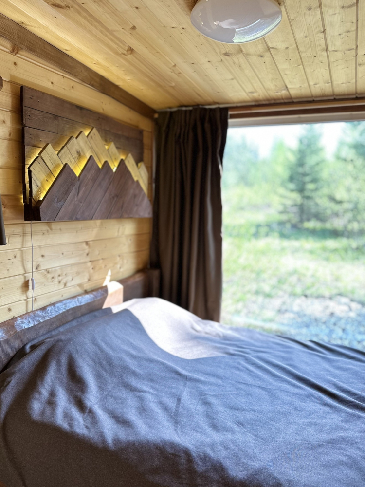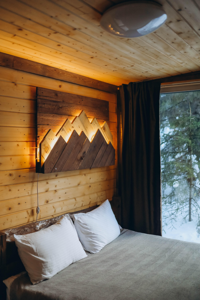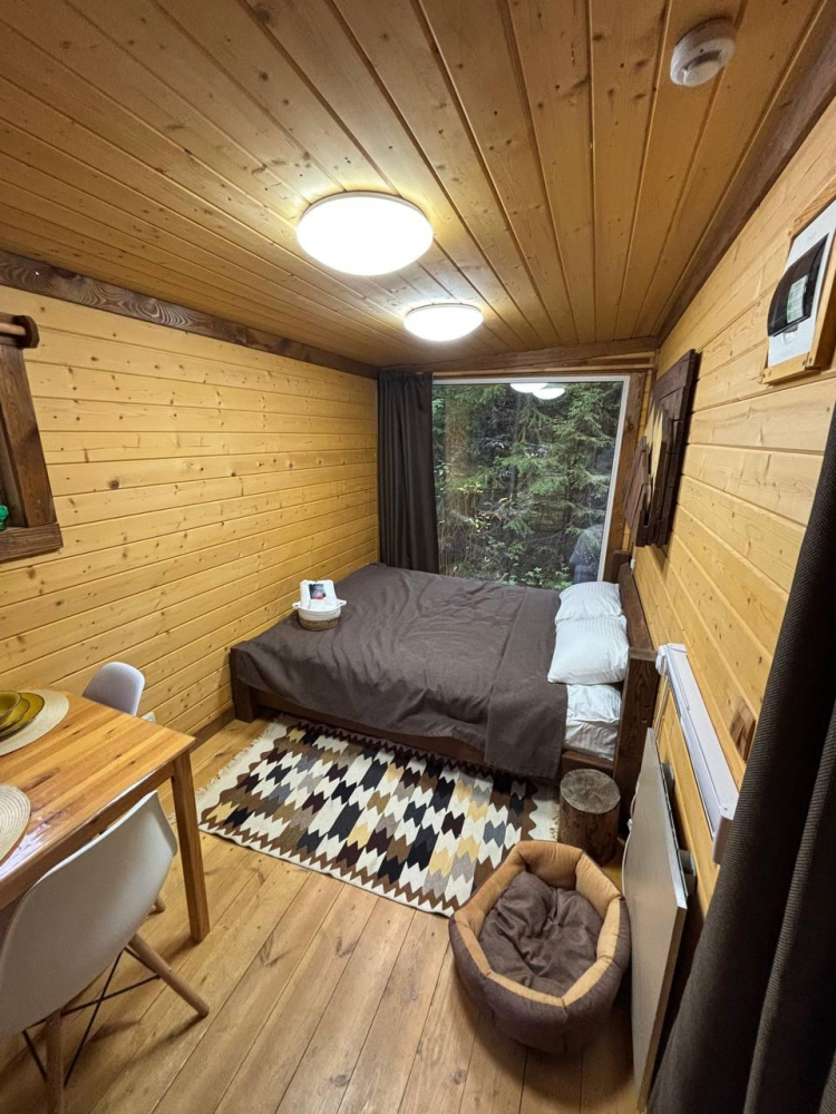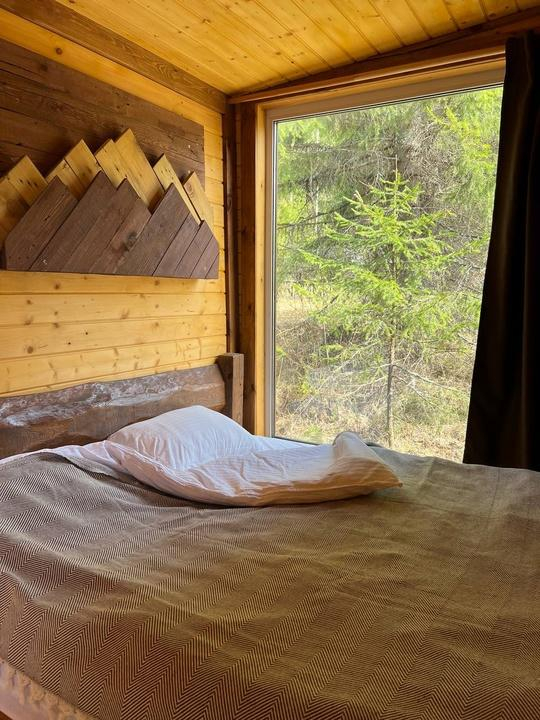 - Спальня: Просторная двухспальная кровать с видом на лес через панорамное окно