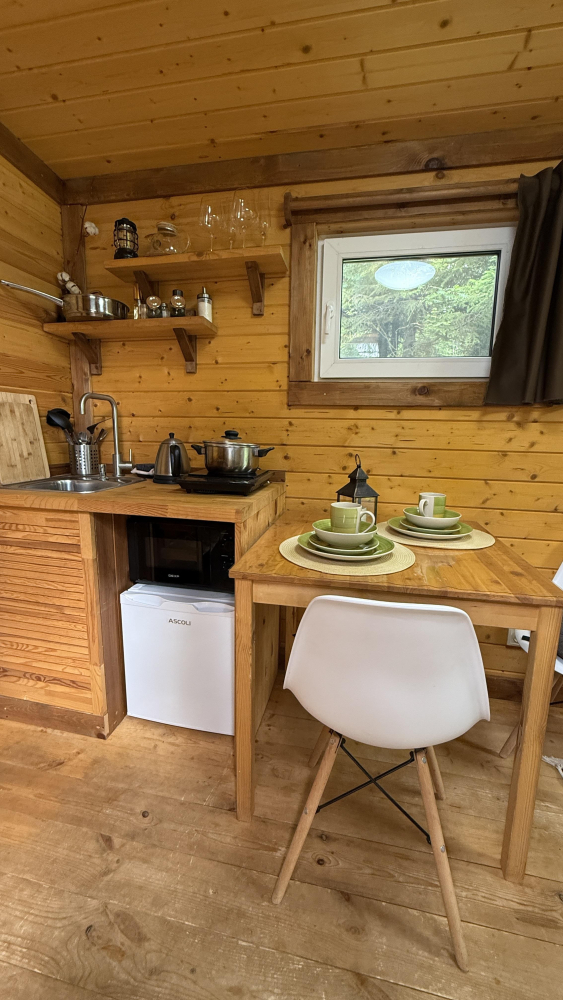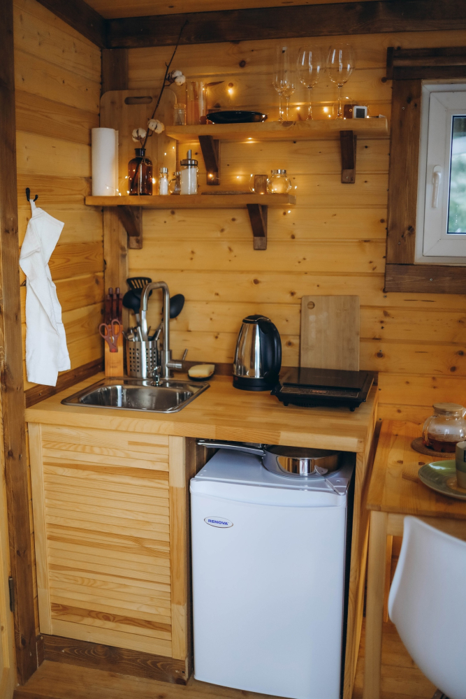 - Кухня: Мини-кухня с техникой (плита, холодильник) и набором посуды