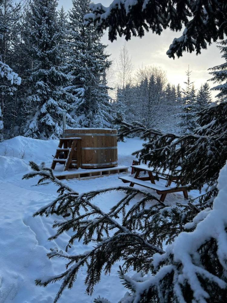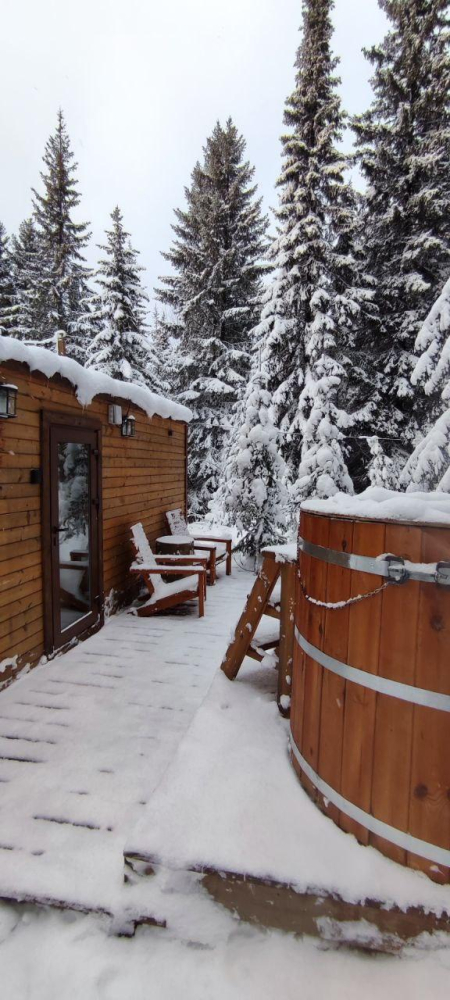 Горячий чан есть около домиков Семейный домик с большой купелью (Эльбрус), ДОМИК ДЛЯ ДВОИХ С ГОРЯЧЕЙ КУПЕЛЬЮ (Шерегеш).