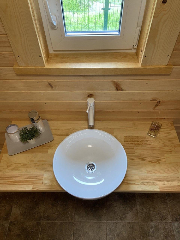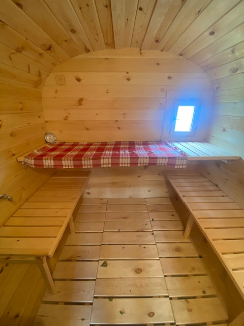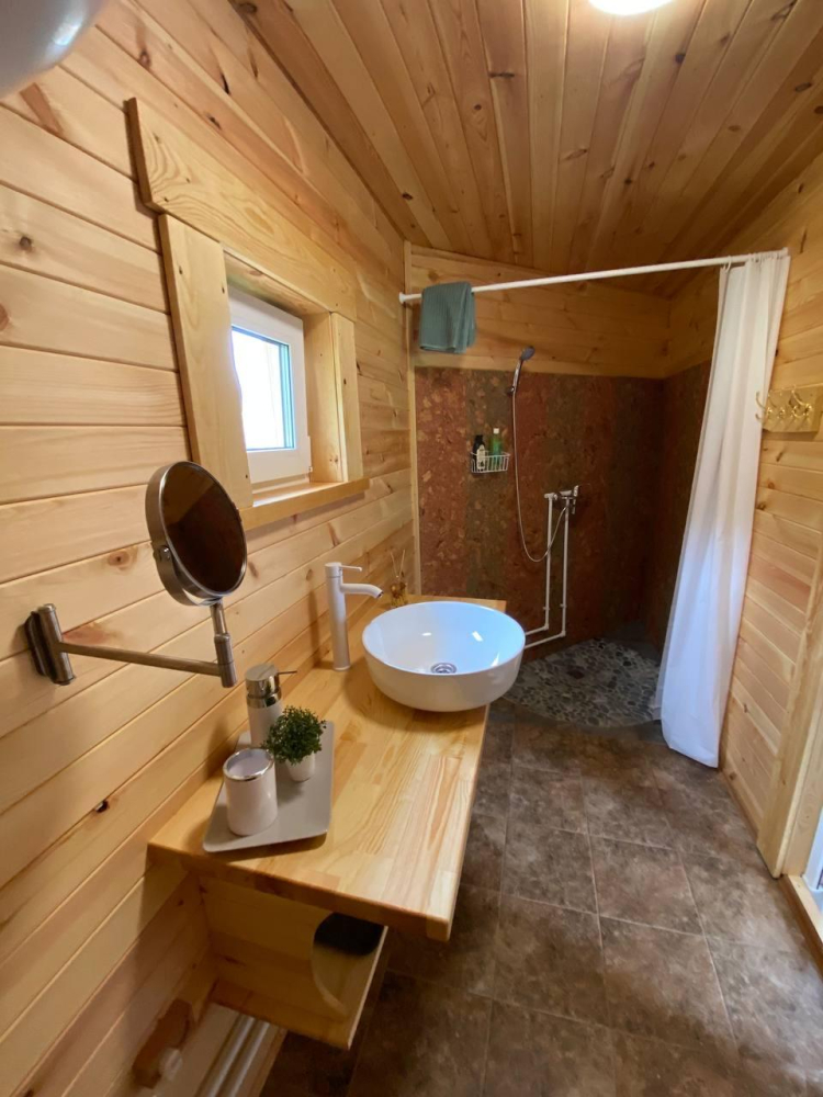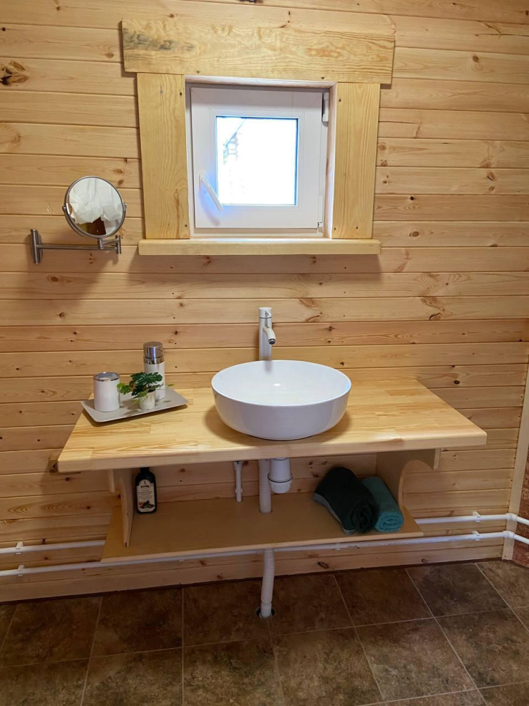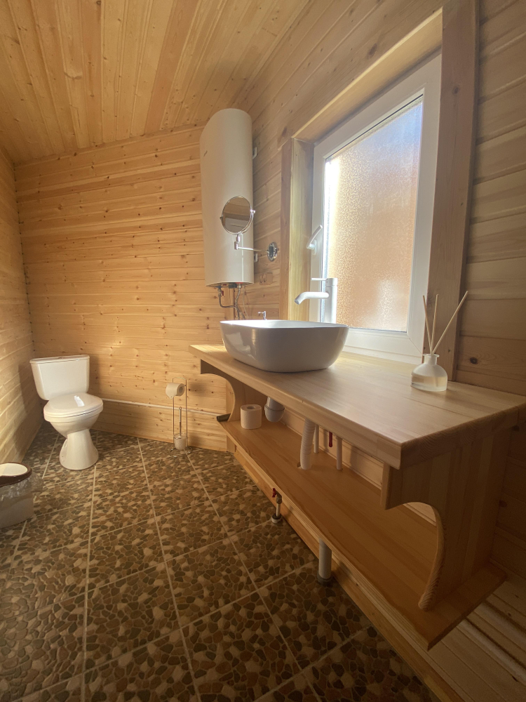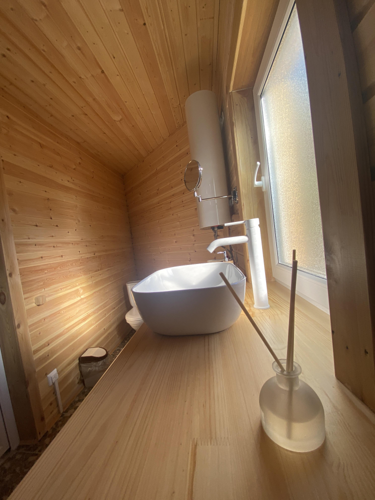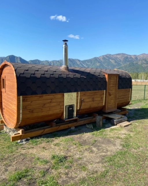 - Баня-бочка из сосны с комнатой отдыха и панорамными окнами на горы.