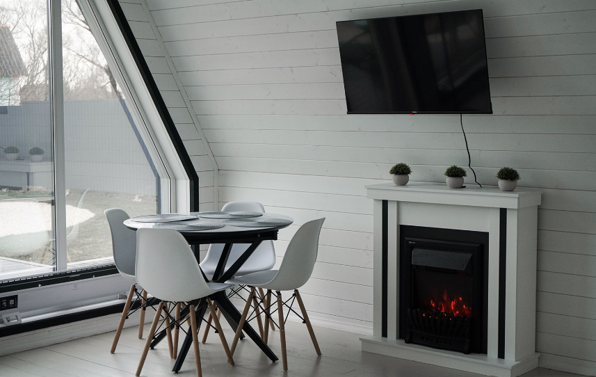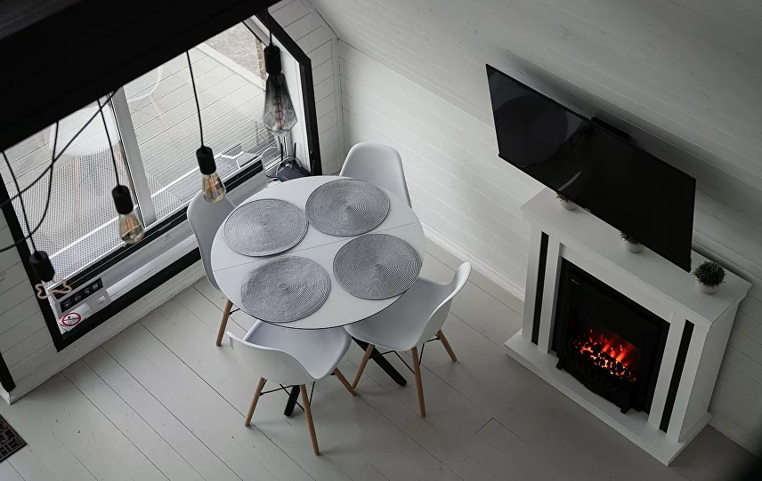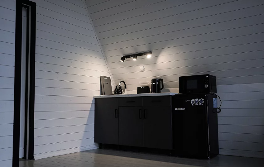 - Кухня-гостиная: Просторная зона со вторым светом, электрокамином, электроплитой, микроволновой печью, холодильником, электрочайником и всей необходимой посудой (бокалы для шампанского, виски, универсальные бокалы, чашки, столовые приборы на 6 персон). Дополнительно: травяные чаи и приправы.