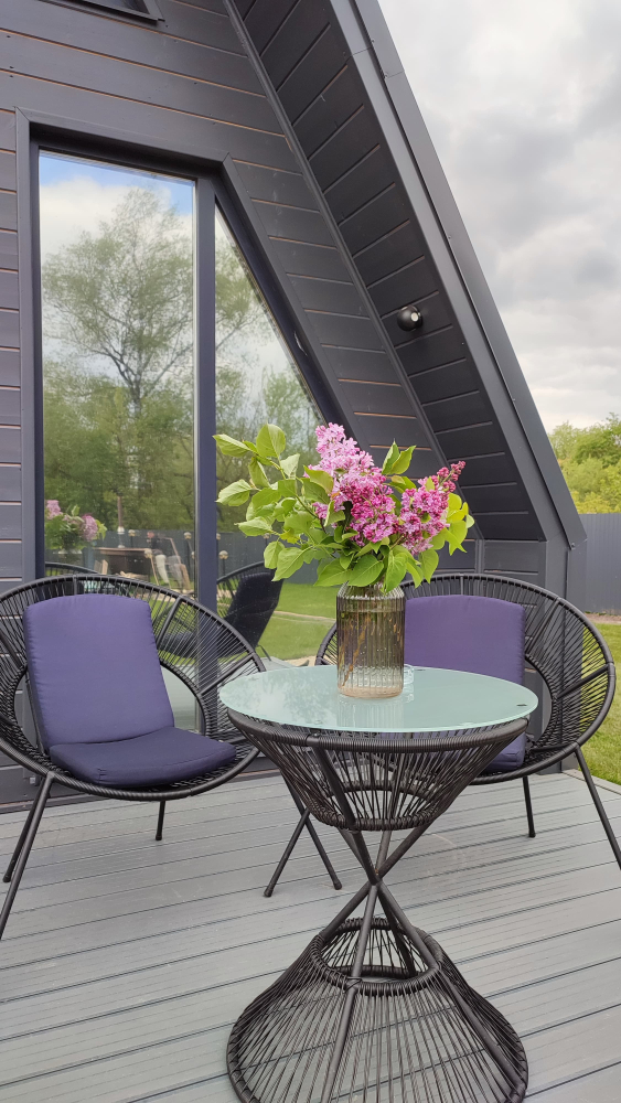 - Зона патио: Оборудована мангалом, сеткой для жарки, шампурами и костровой чашей.