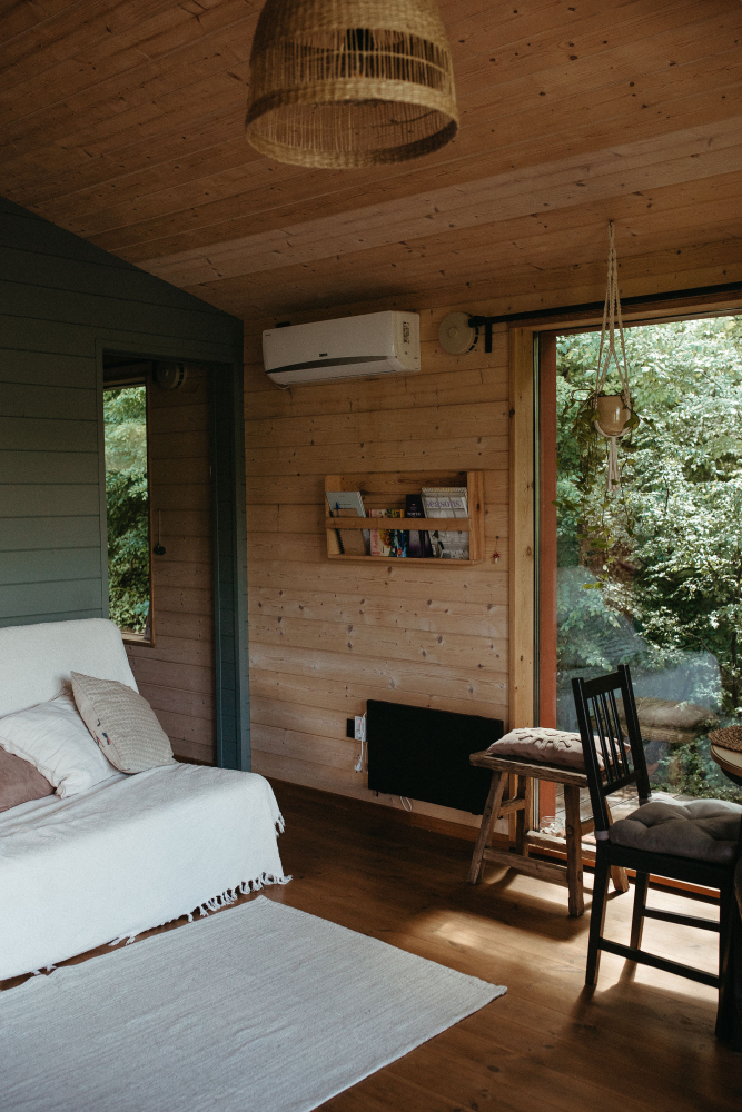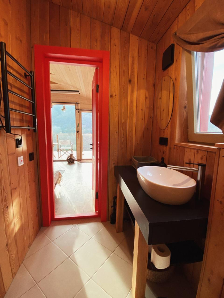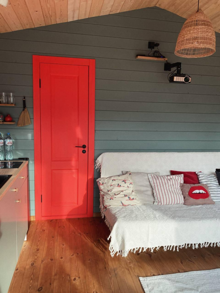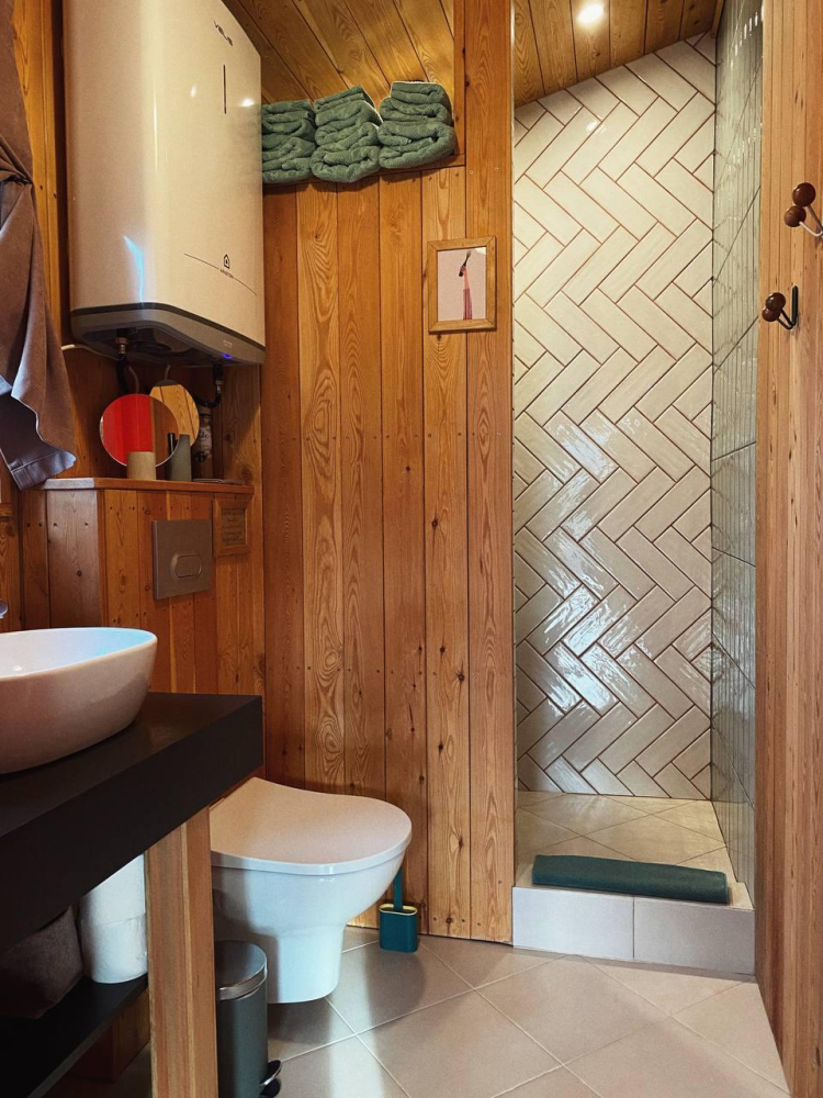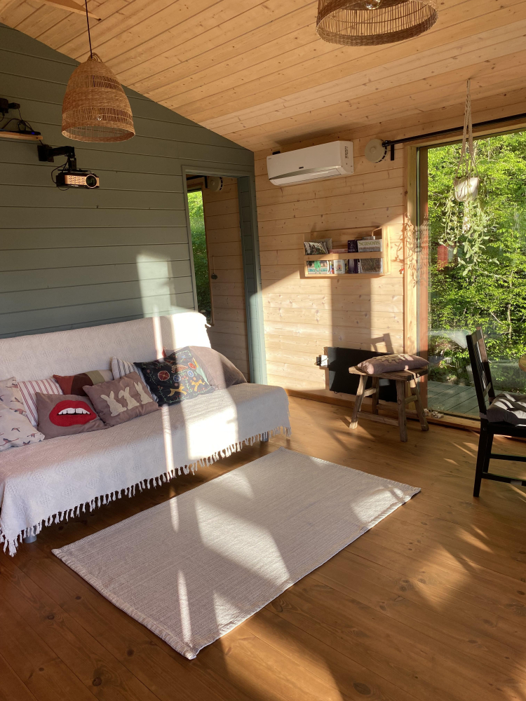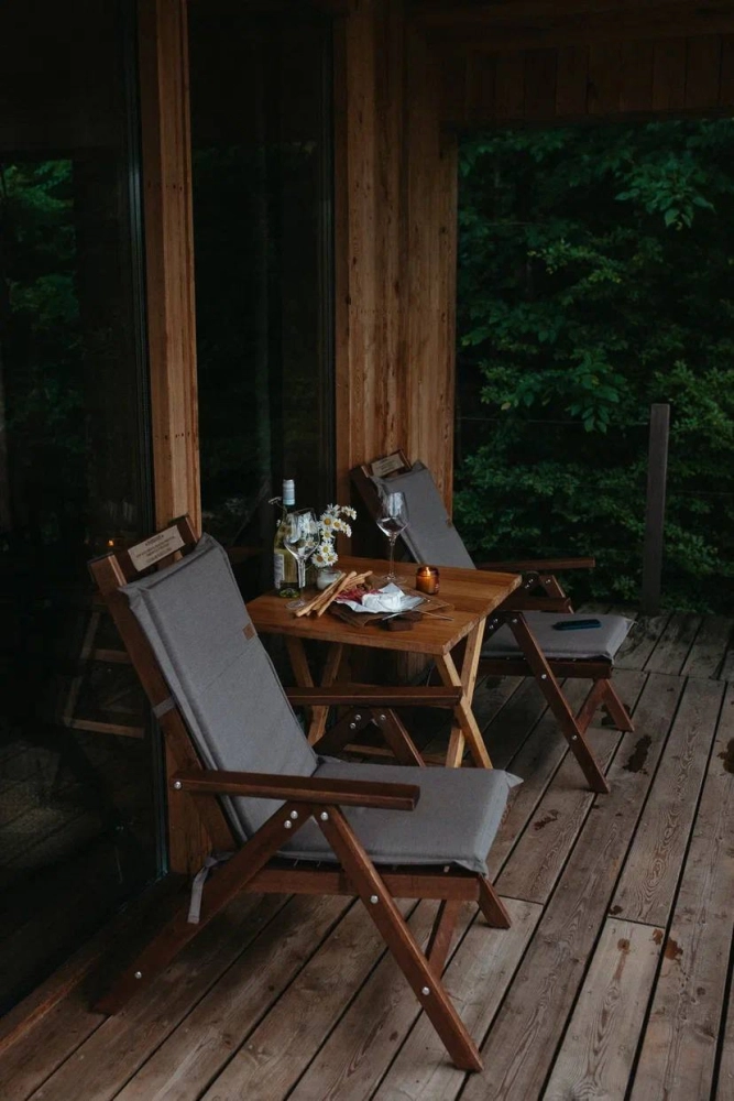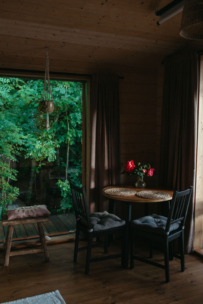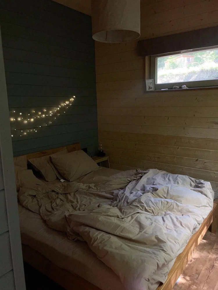 - Спальня и гостиная: Уютные спальные места, ортопедический матрас, панорамные окна с видом на лес, кинопроектор для просмотра фильмов и сериалов.