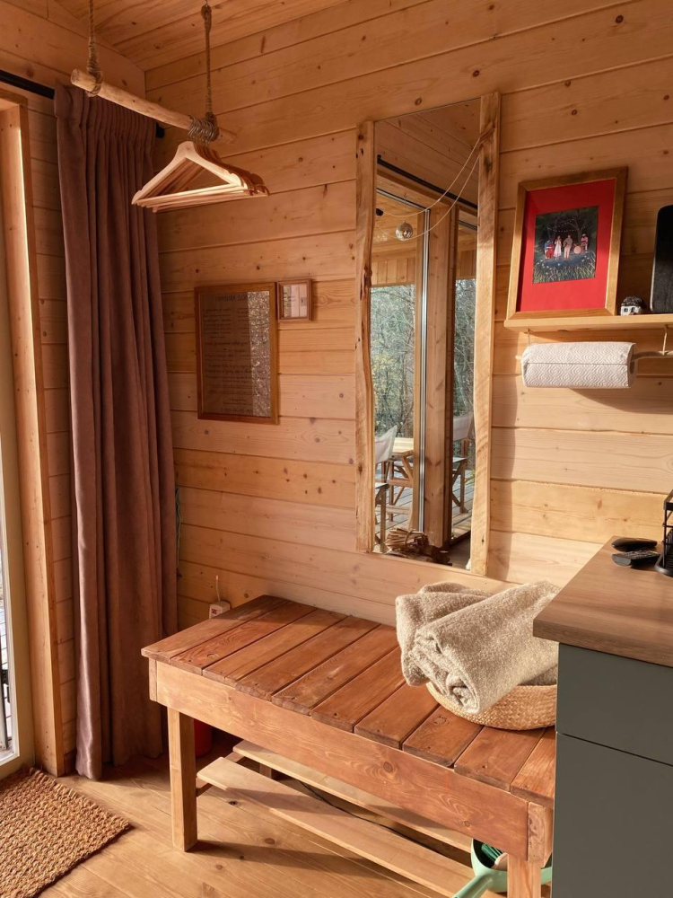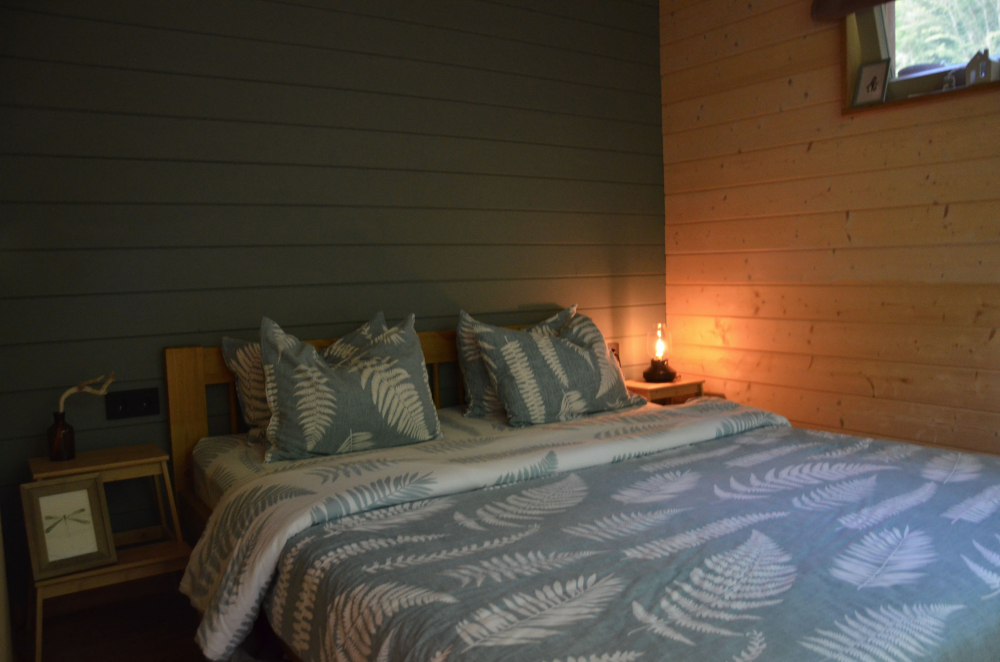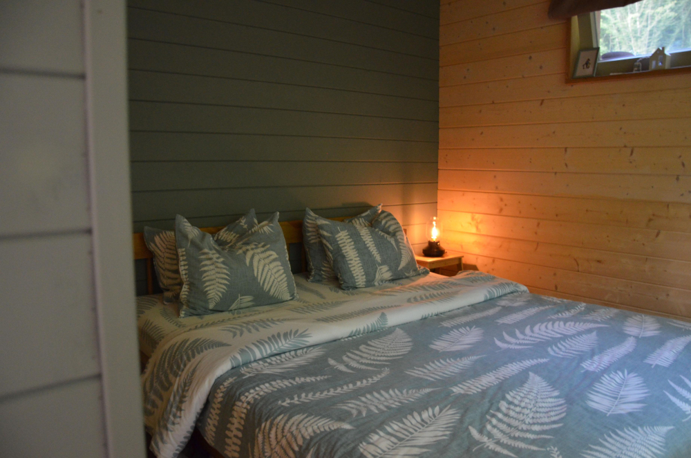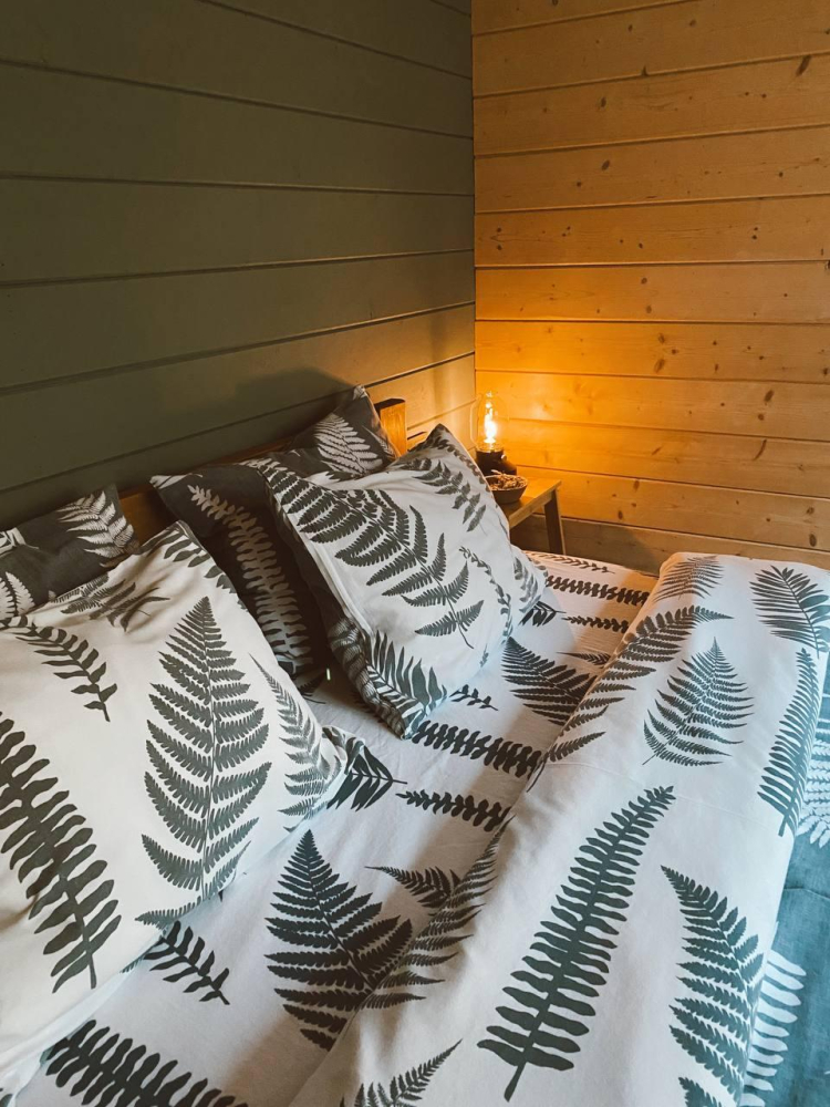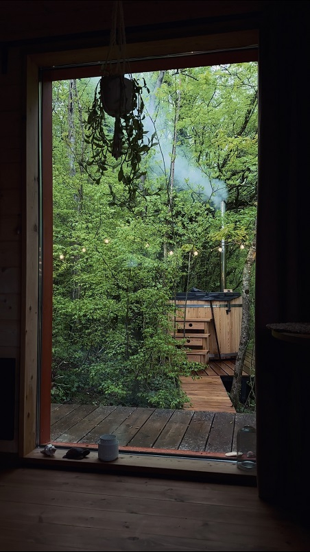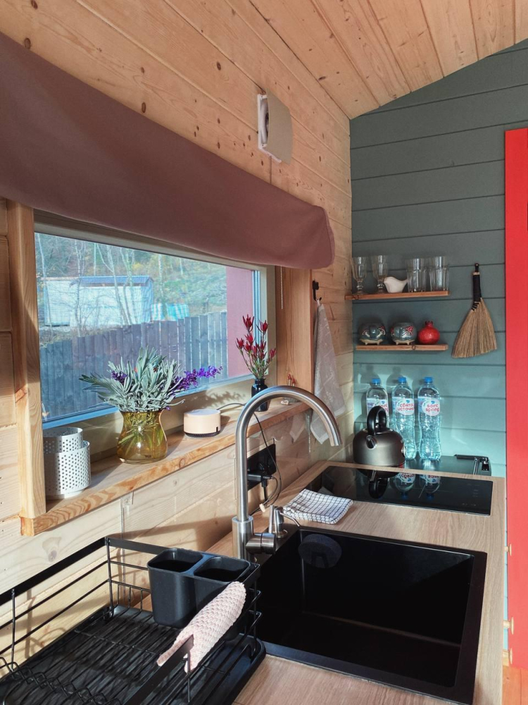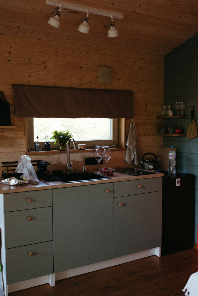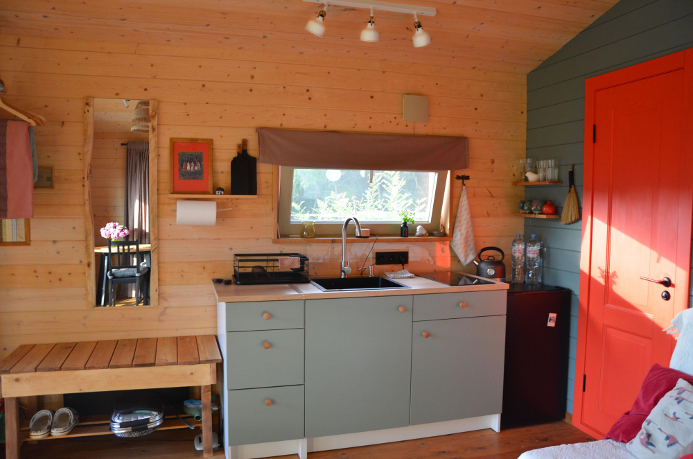 - Спальня и гостиная: Уютные спальные места, ортопедический матрас, панорамные окна с видом на лес, кинопроектор для просмотра фильмов и сериалов.