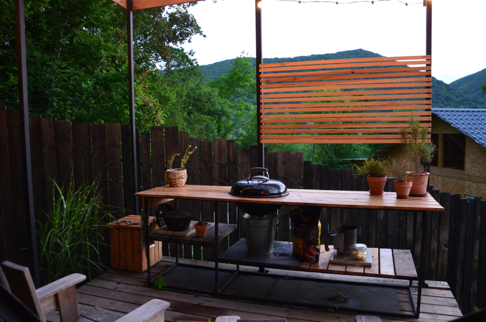 На нижней террасе расположена зона барбекю с угольным грилем и стартером фирмы Weber. Мы предоставляем в день заезда пачку угольных брикетов. У нас нельзя пользоваться жидким розжигом. В стеклянной банке вы найдете роллы для розжига пропитанные маслами.