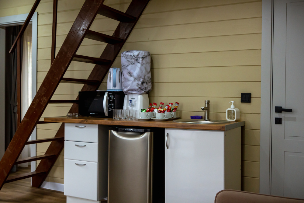 - Кухня: холодильник, микроволновка, электрочайник, полный набор посуды.