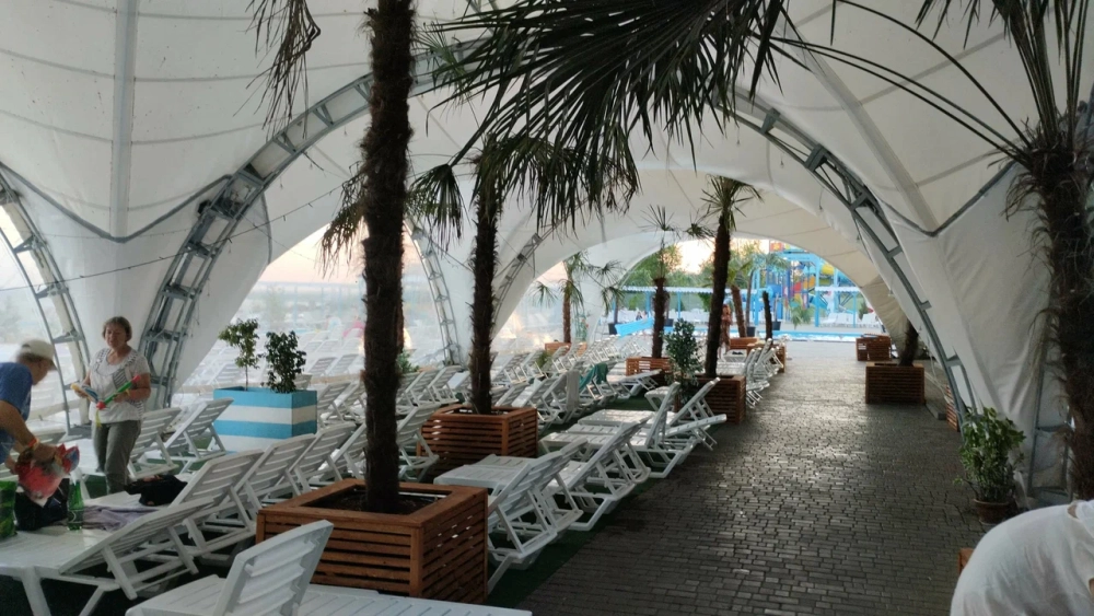 - Теплый шатер с живыми пальмами, гардеробом, душевыми и фенами.