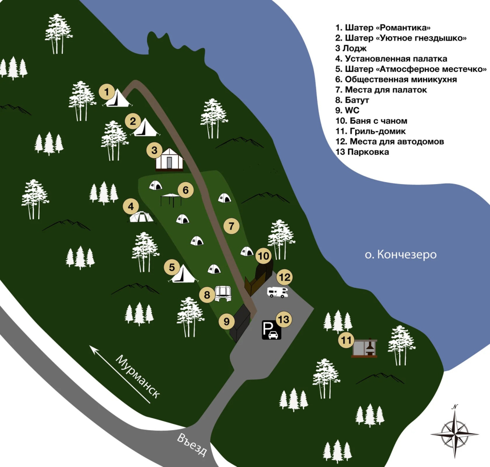 Кемпинг расположен на берегу озера, всего в 25 минутах езды от Петрозаводска и 24 минутах от международного аэропорта. Вас окружат вековые сосны, чистейший воздух и панорамные виды на озеро. Рядом — знаменитые достопримечательности Карелии: водопад Кивач, потухший вулкан Гирвас, гора Сампо, целебный источник «Марциальные воды», музей «Кижи» и многие другие.