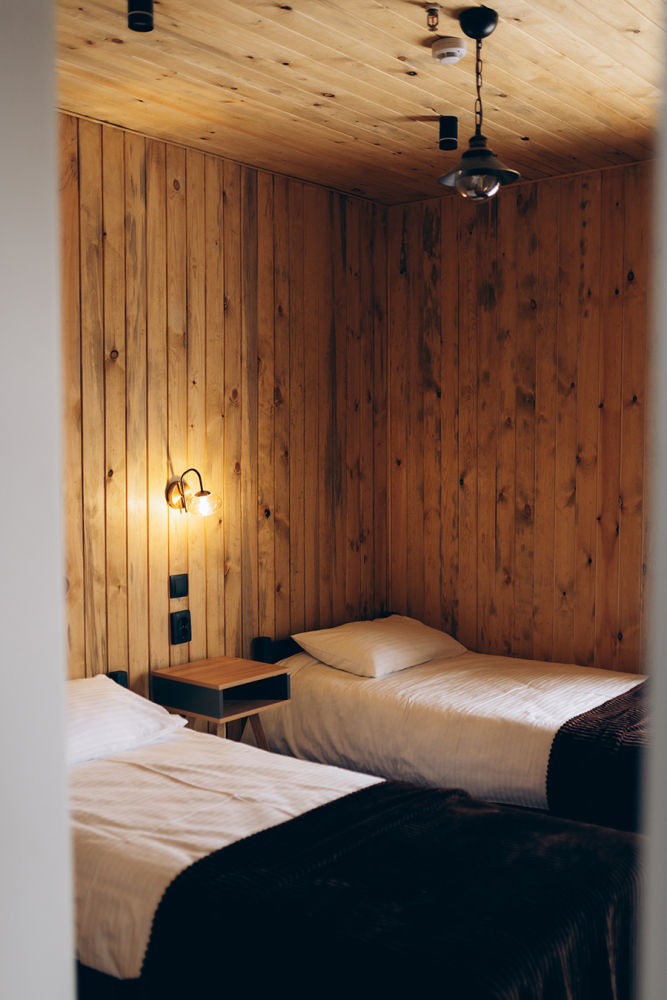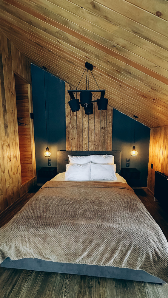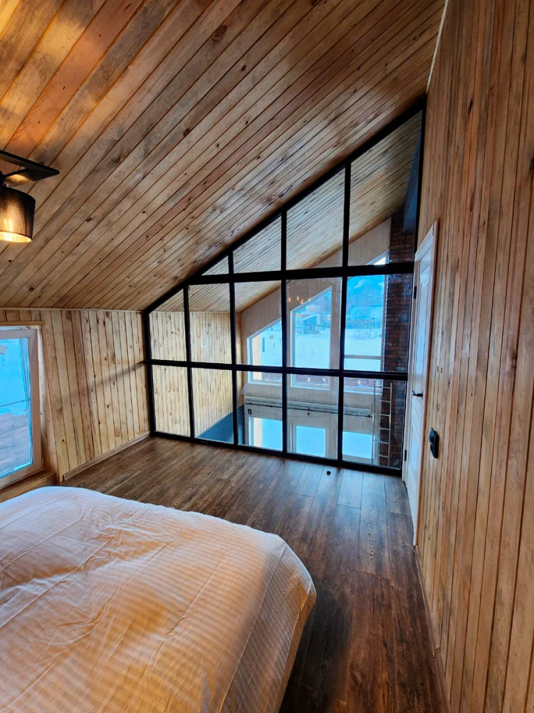 - Спальни: Уютные кровати, стильный дизайн, панорамные окна с видом на горы.