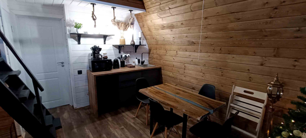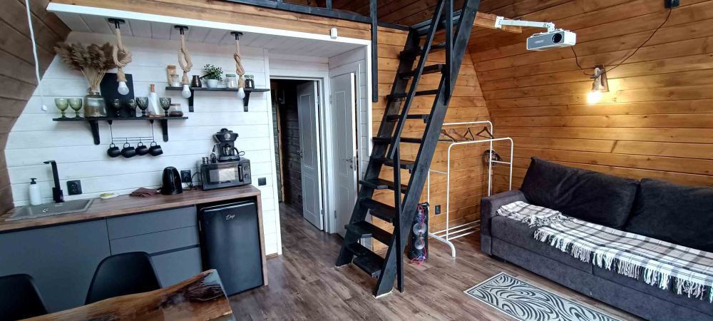 - Кухня-гостиная: Полностью оснащена бытовой техникой (холодильник, плита, микроволновка), посудой и уютной зоной отдыха.