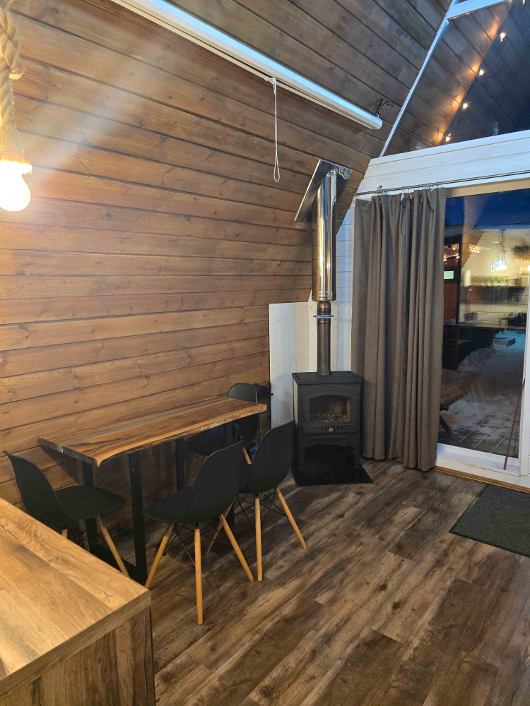 На территории A-Frame коттеджей расположены 2 бани, доступных для аренды — закрытая русская баня (Aframe 1) и с панорамными окнами (Aframe 2). Стоимость 3000 рублей за 4 часа