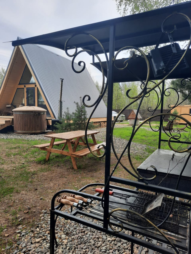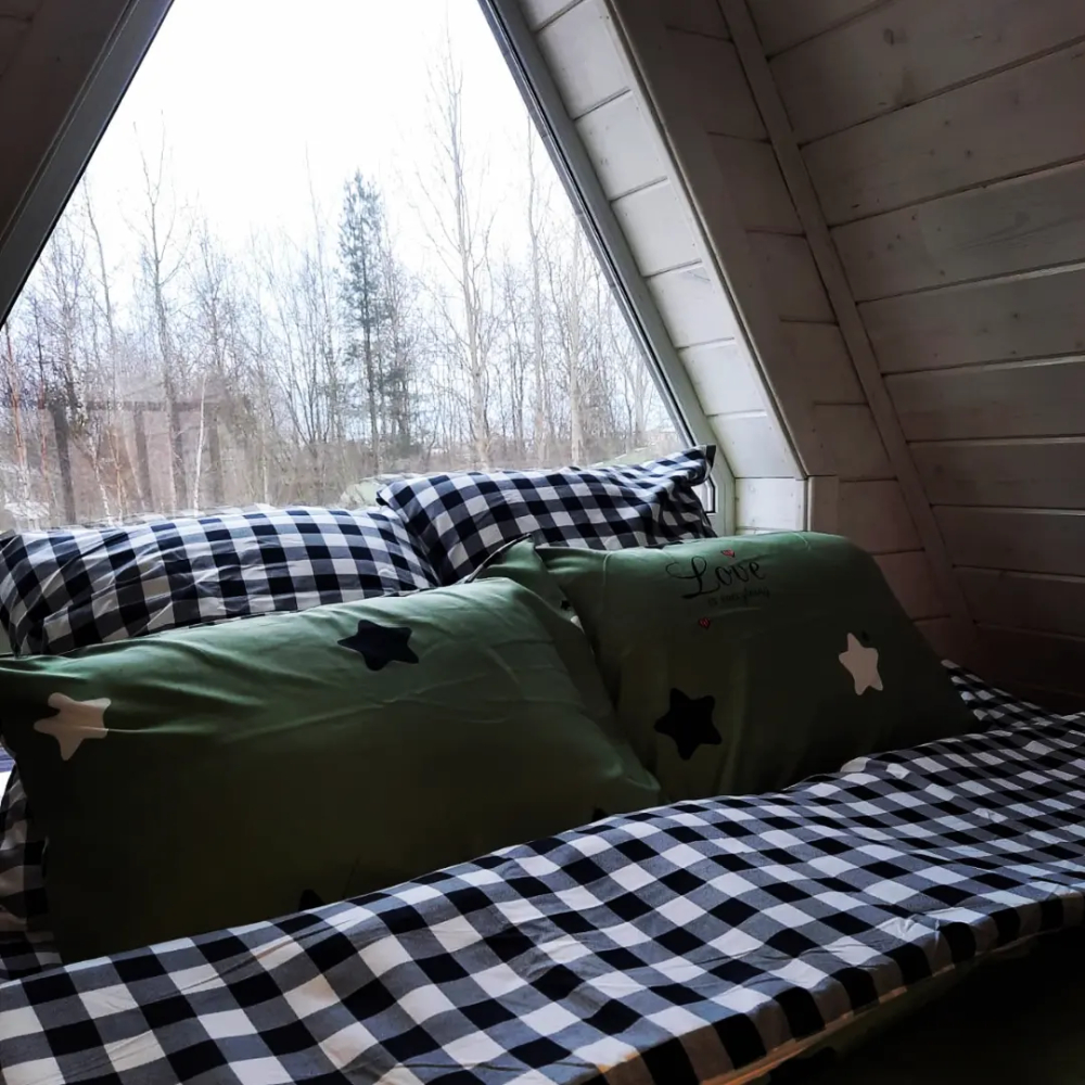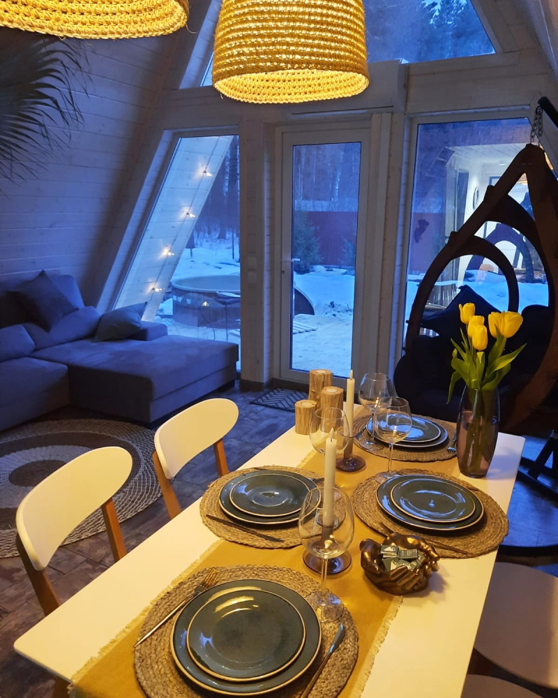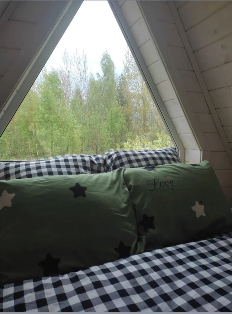 A-frame дом расположен в уединённом и атмосферном месте, прямо на краю большого соснового бора. Здесь можно: