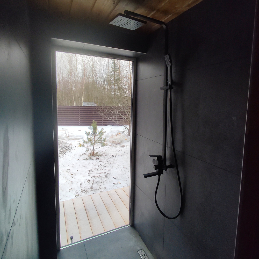 Санузел с панорамным окном в душевой