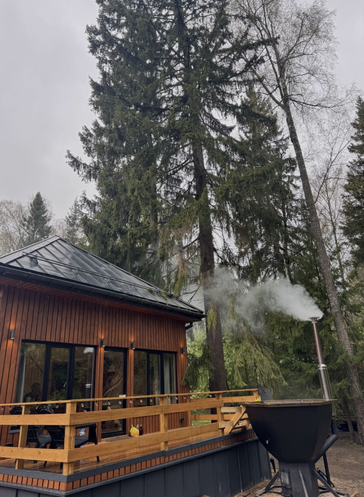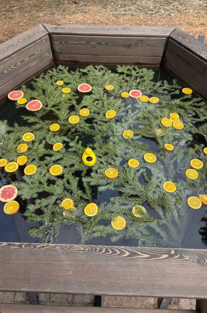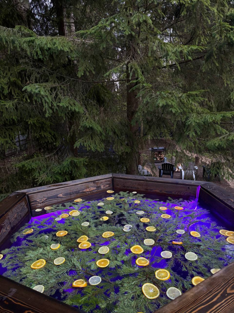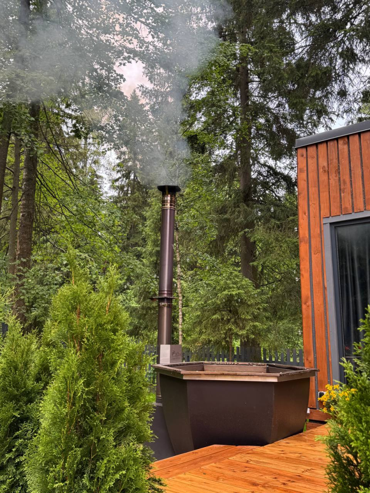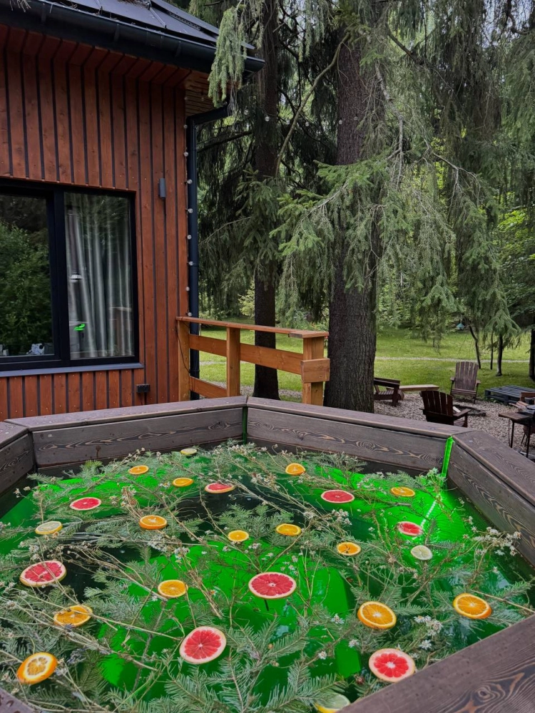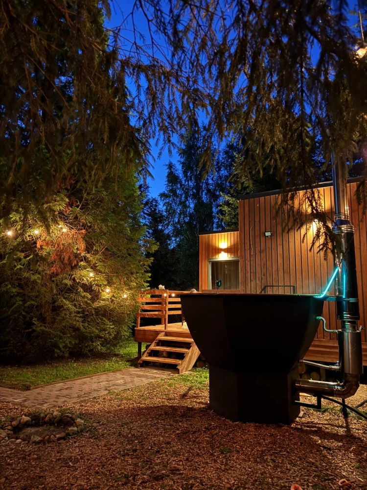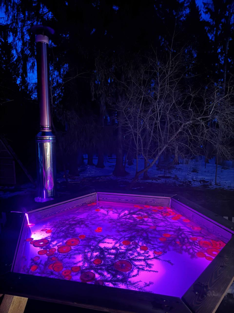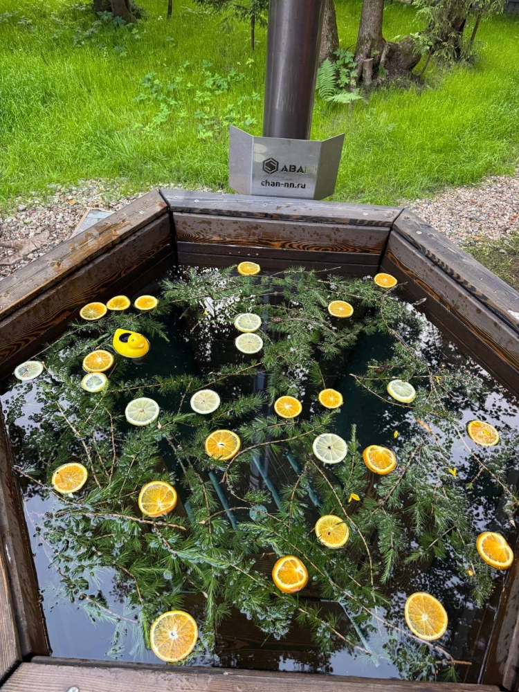 - У каждого дома свой банный чан с подсветкой стоимость от 7000 р. Ограничений по времени парения нет. Можем добавить пихту, луговые травы и цитрусы для особой ароматерапии.
