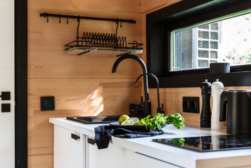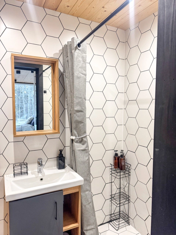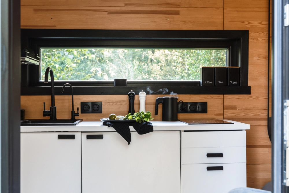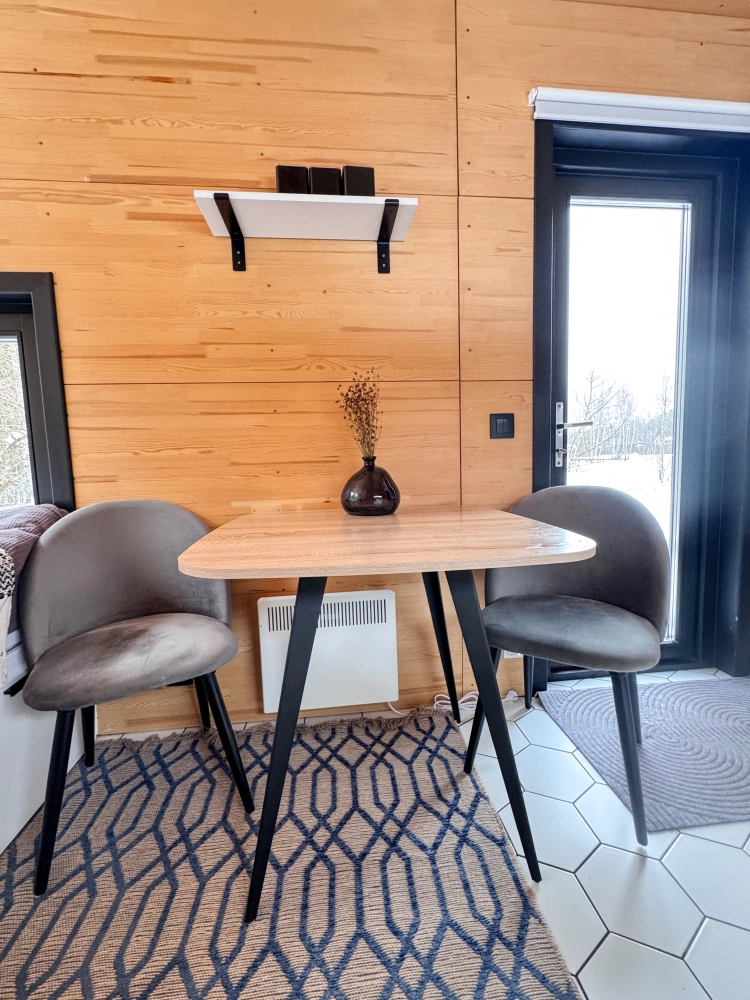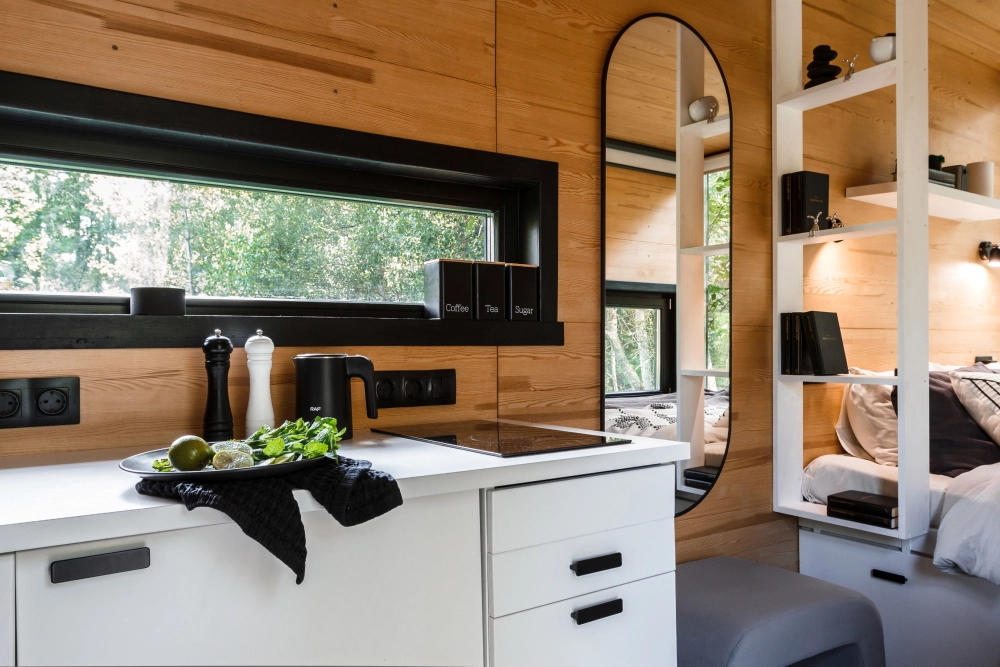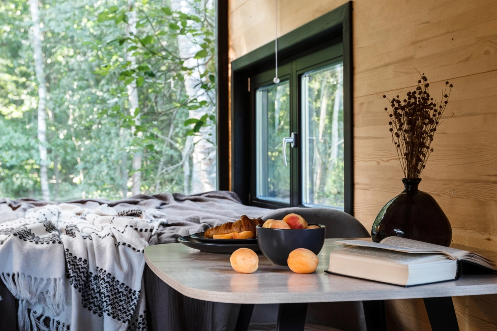 Дом Вода – уединённый, расслабляющий, текучий. Этот дом создан для тех, кто ищет покой и мягкое восстановление. Панорамные окна смотрят на лес — идеально, чтобы раствориться в тишине природы.