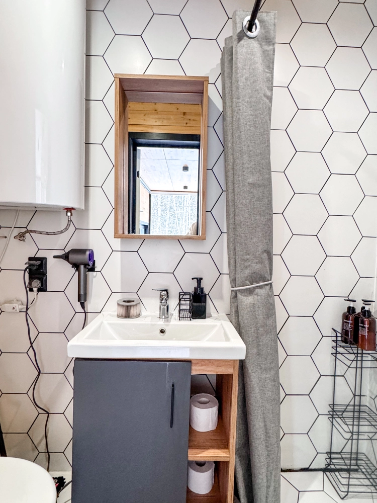 Ванная комната с туалетом, душевой кабиной и теплым полом. В ванной есть полотенцесушитель, фен, по два полотенца для каждого гостя, жидкое мыло и гель для душа.