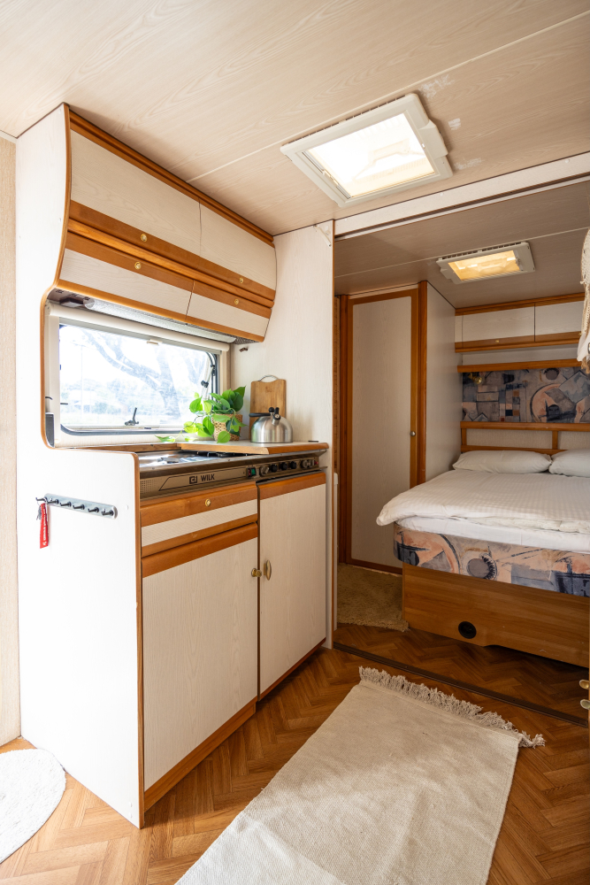 Отдельные зоны кухни и спальни, подвижная перегородка между ними -