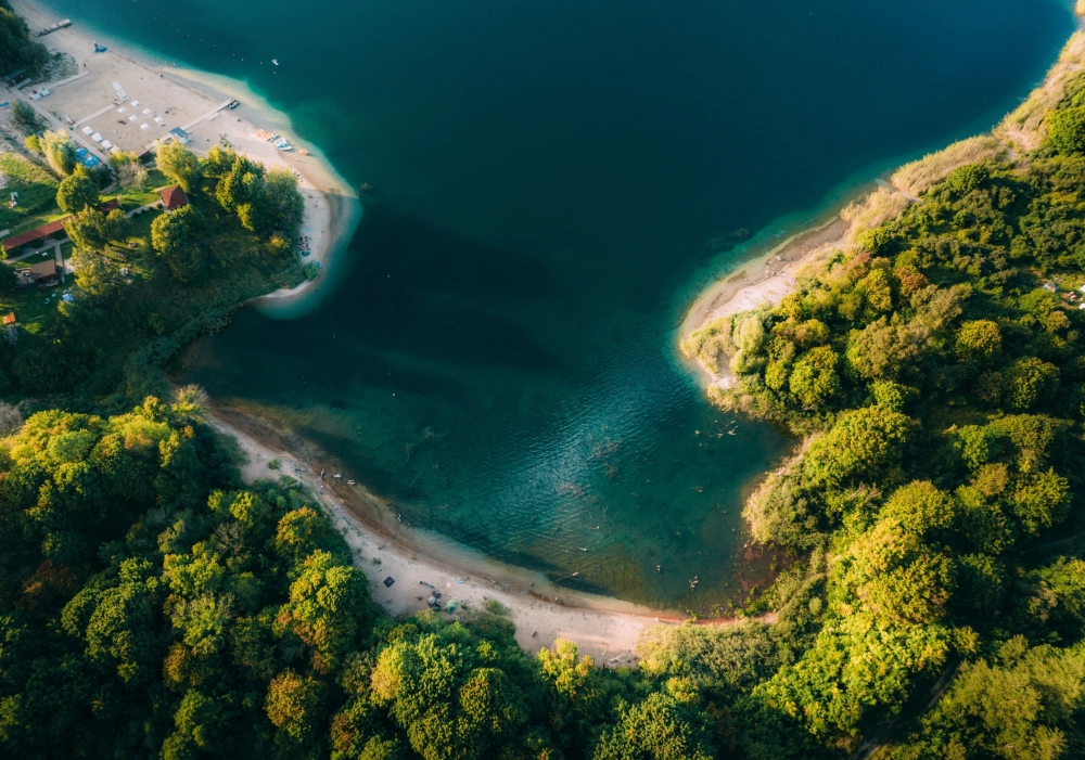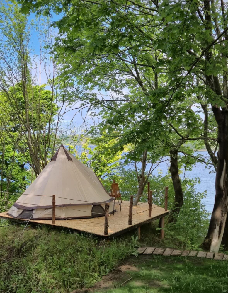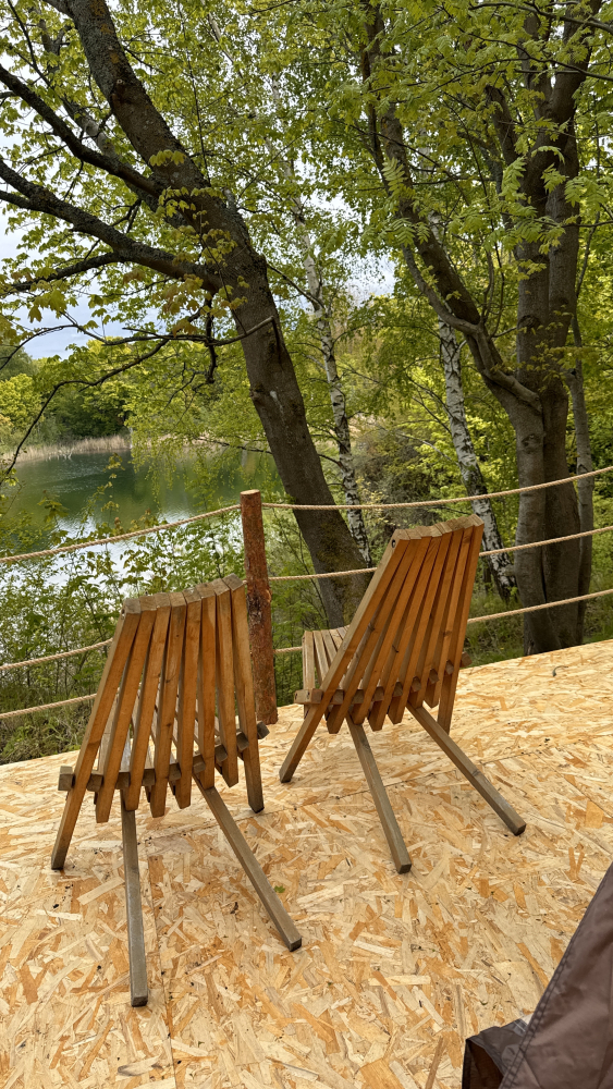 Атмосферный объект размещения на зеленой лужайке в тени деревьев на берегу теплого чистого прозрачного озера "Синявинского" — бывшего карьера по добыче янтаря.