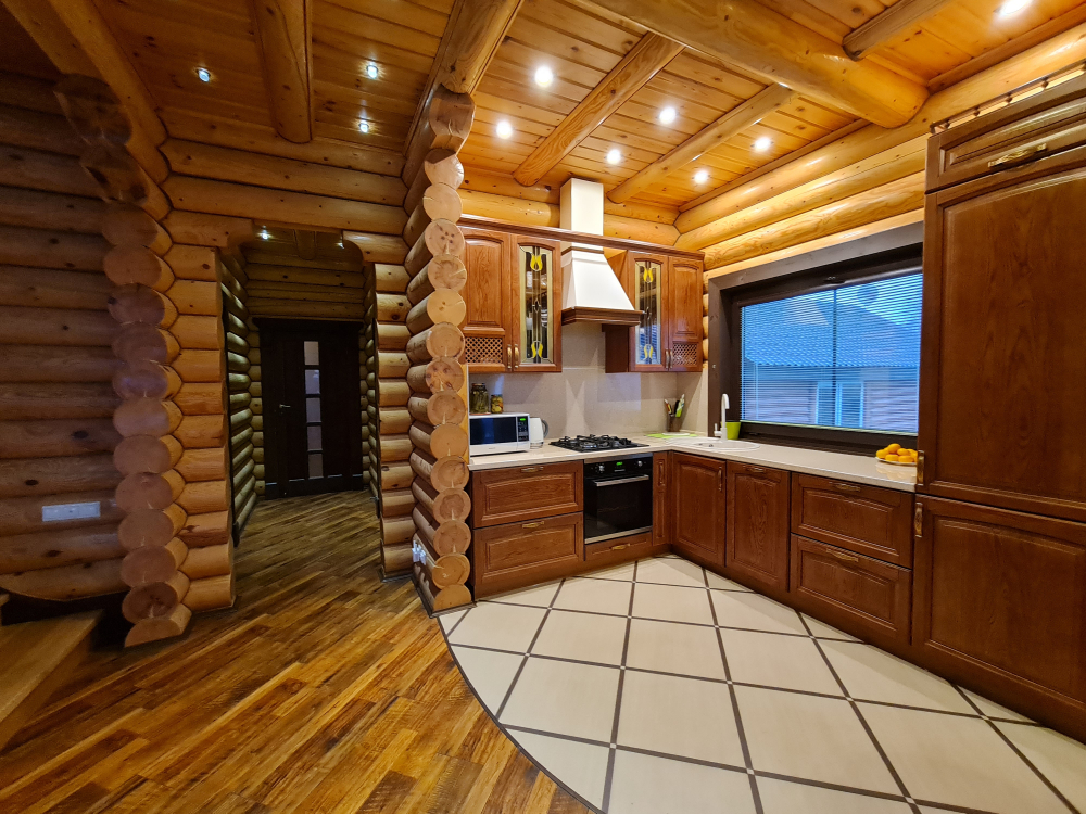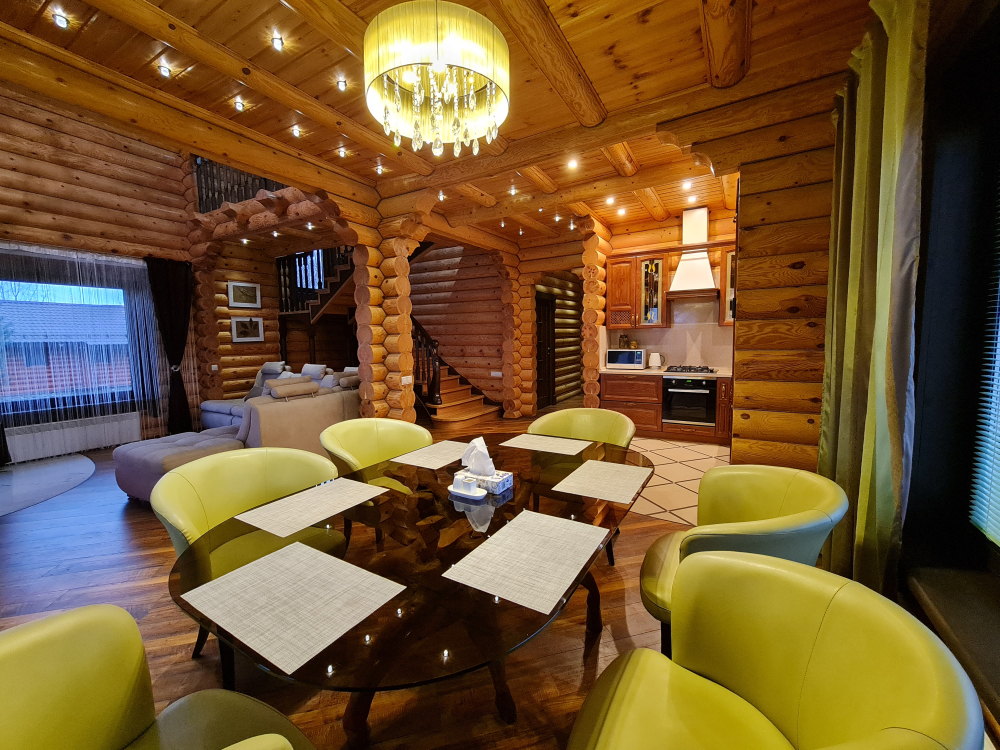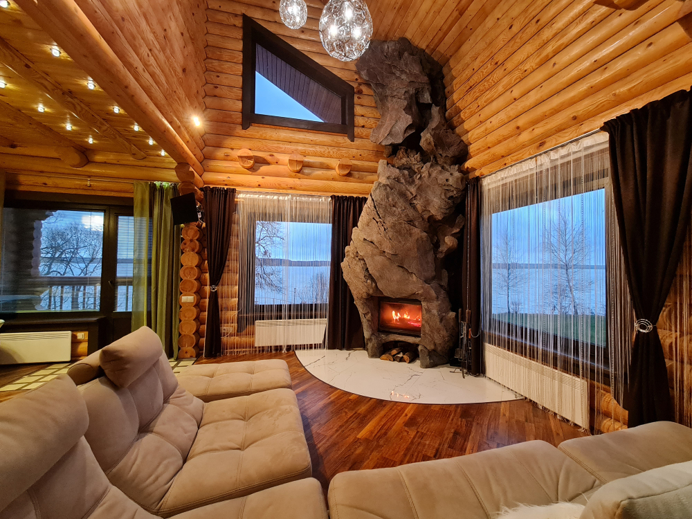Большой зал: гостиная, релакс-зона с эксклюзивным дровяным камином, столовые и кухонные зоны.