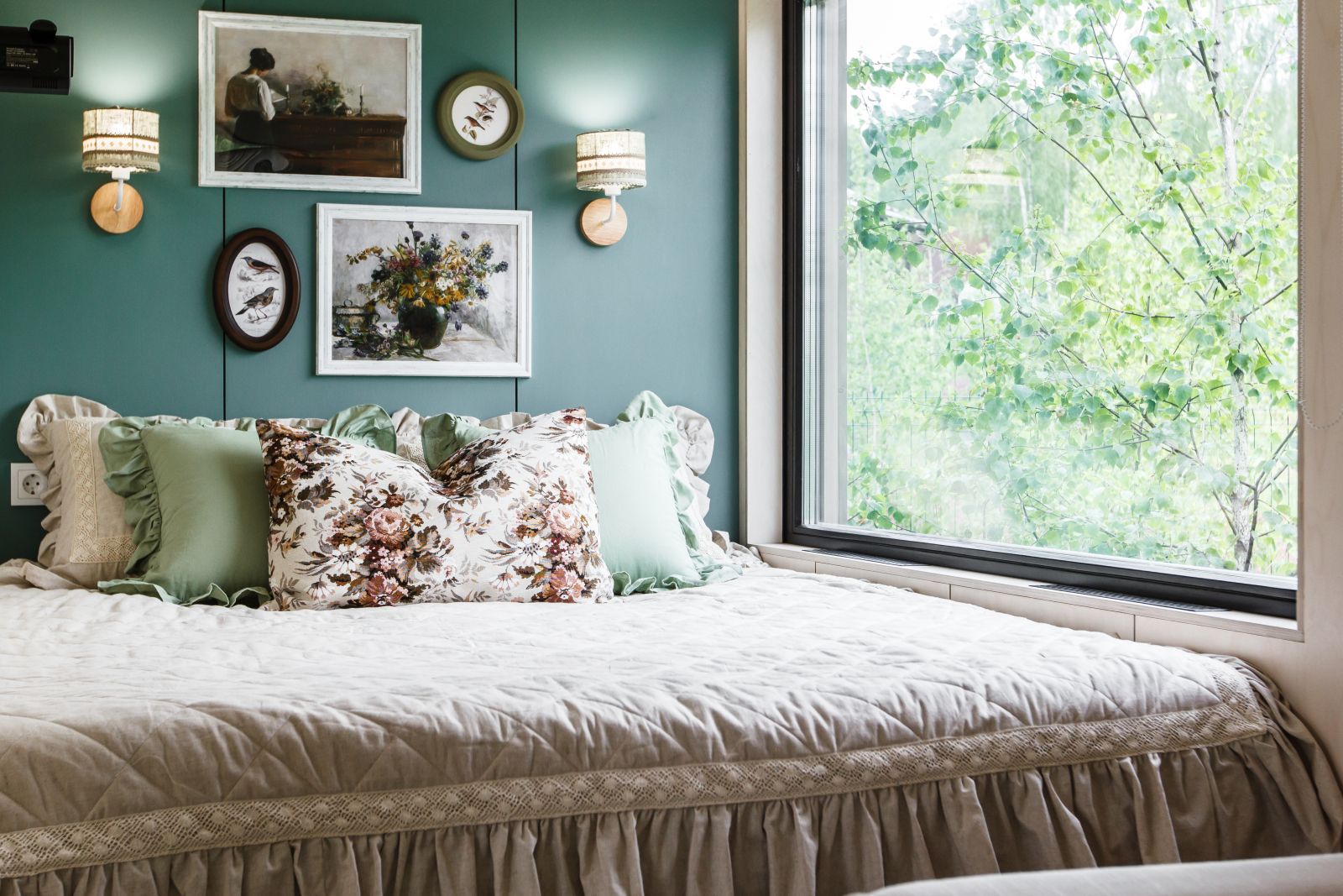 Уютная двуспальная кровать с ортопедическим матрасом на подиуме с видом на лес и озеро.