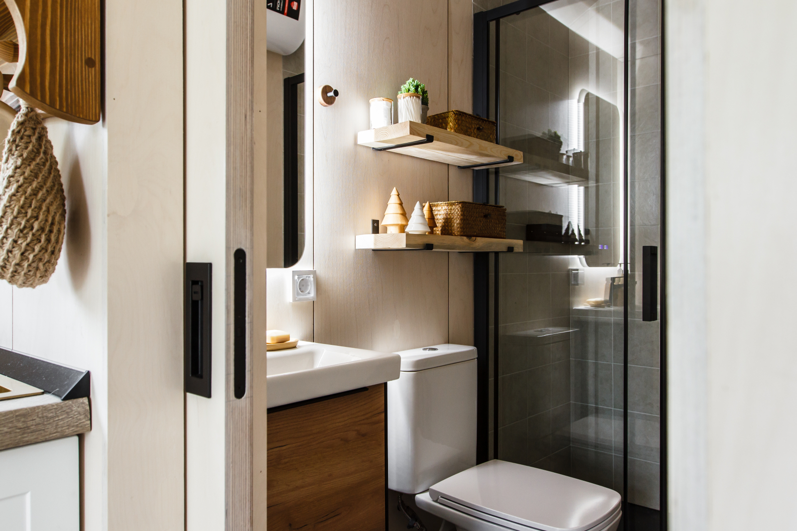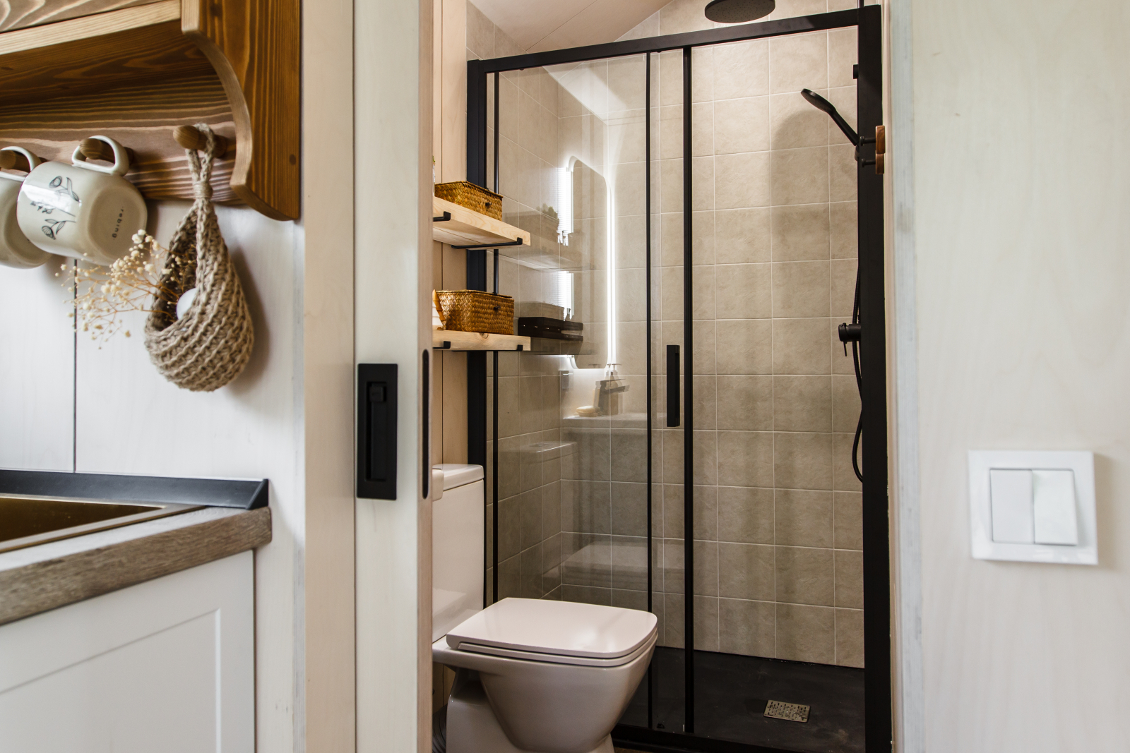 Современный санузел с туалетом, душевой кабиной и теплым полом.