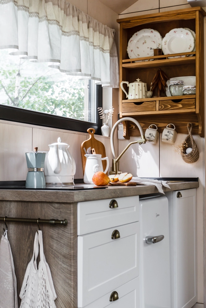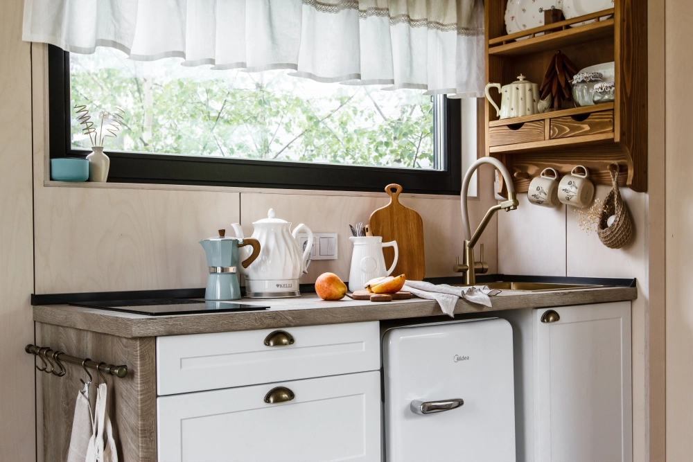 Полностью оборудованная: холодильник, чайник, ручная кофеварка, варочная панель, микроволновая печь.