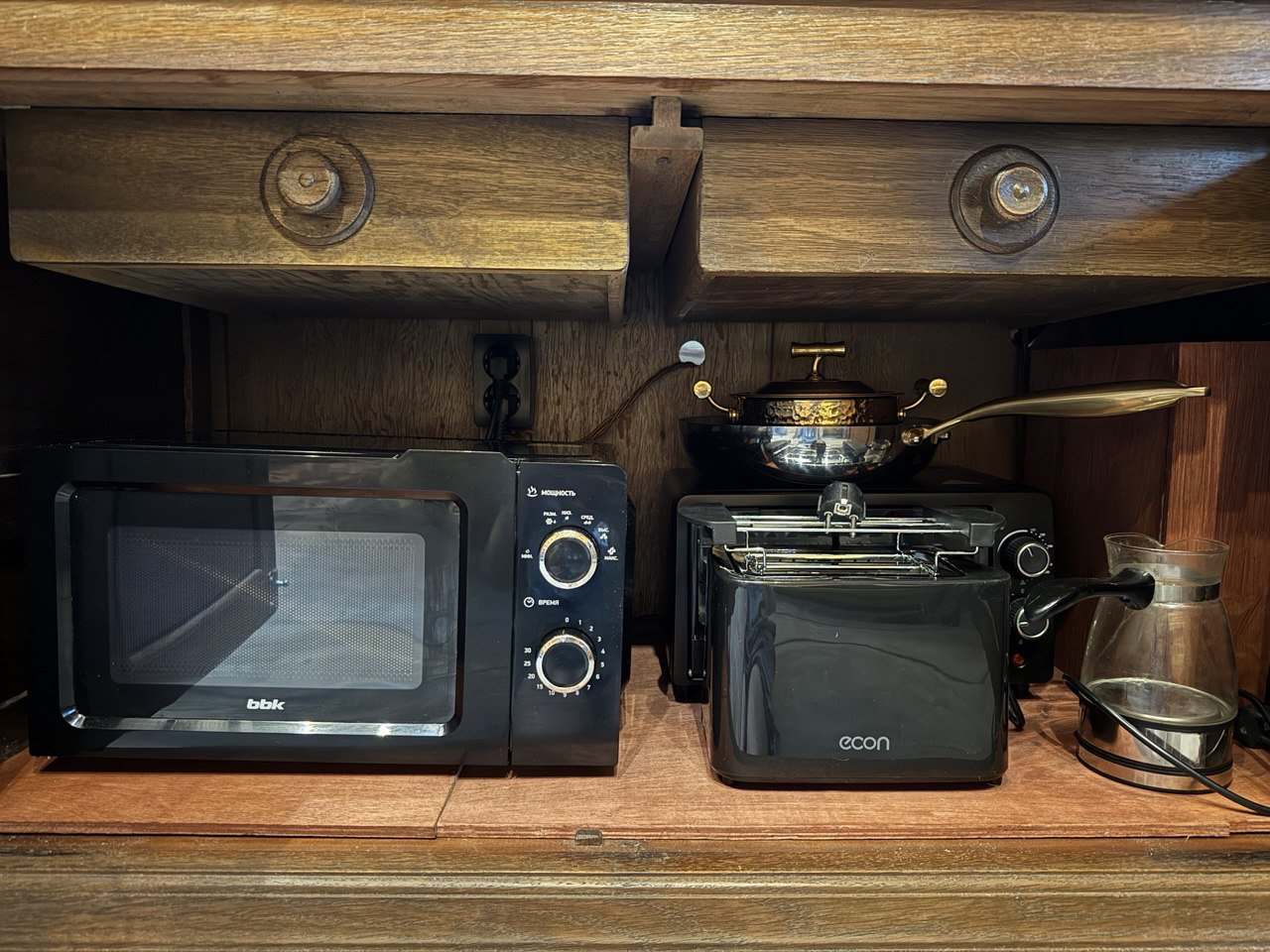 микроволновая печь, печь-гриль, индукционная панель на 2 конфорки, чайник, электронный-турка, надо кастрюль, сковорода, посуда для полноценной сервировки Вашего застолья