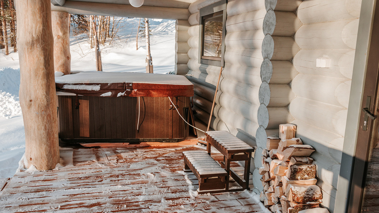 Горячий чан есть около домиков Коттедж с 3 спальнями №7 с джакузи.