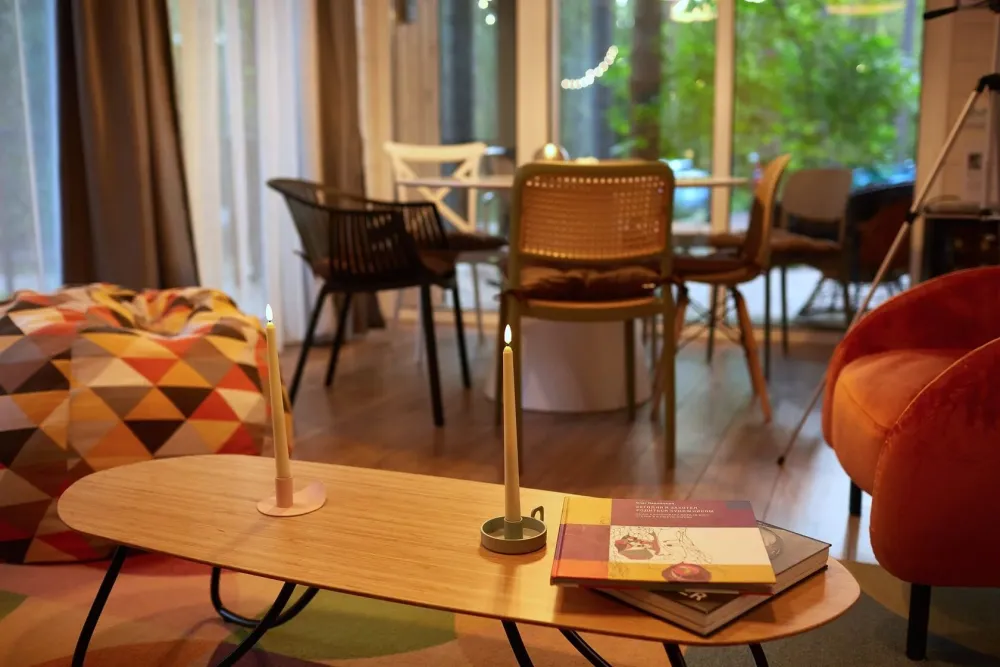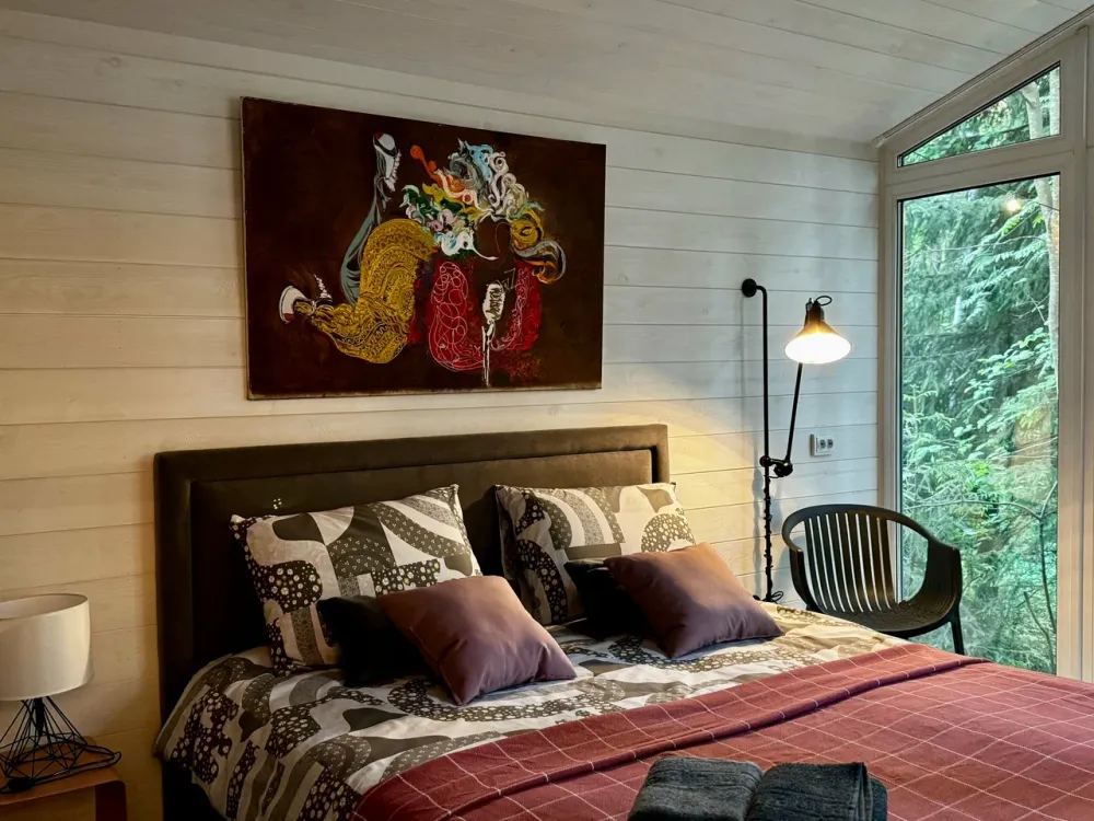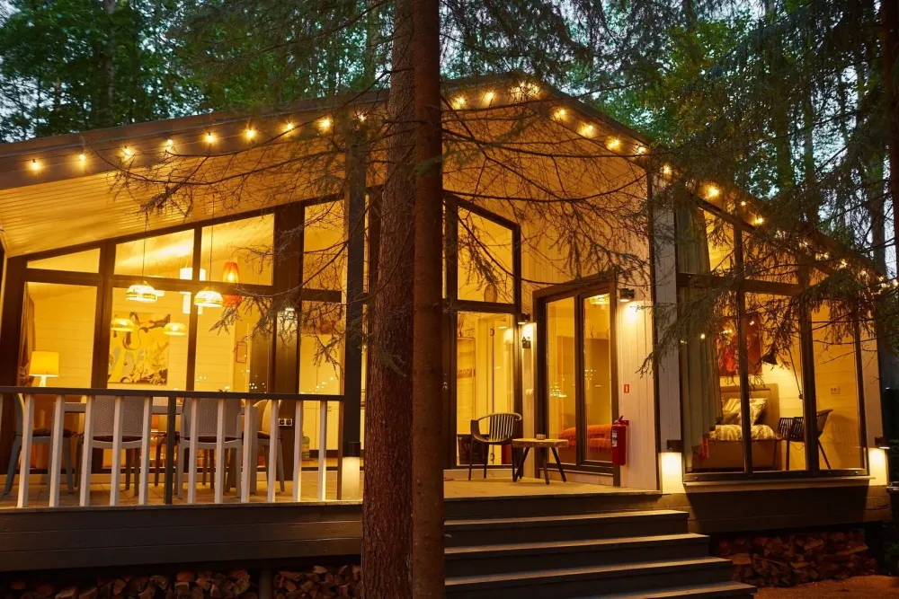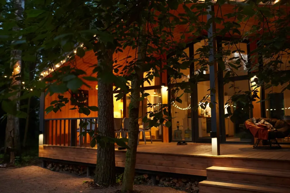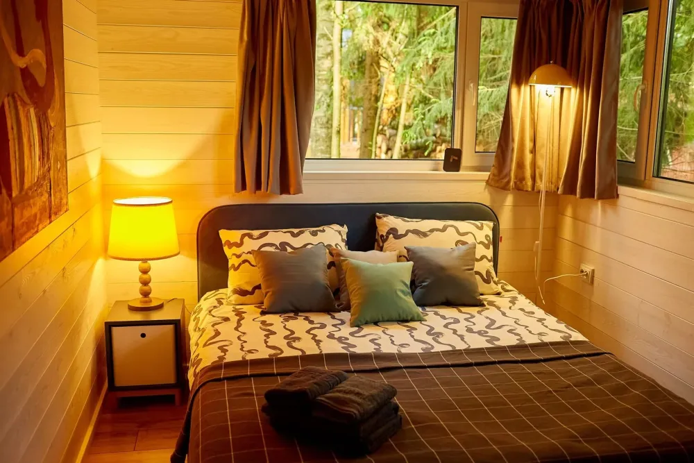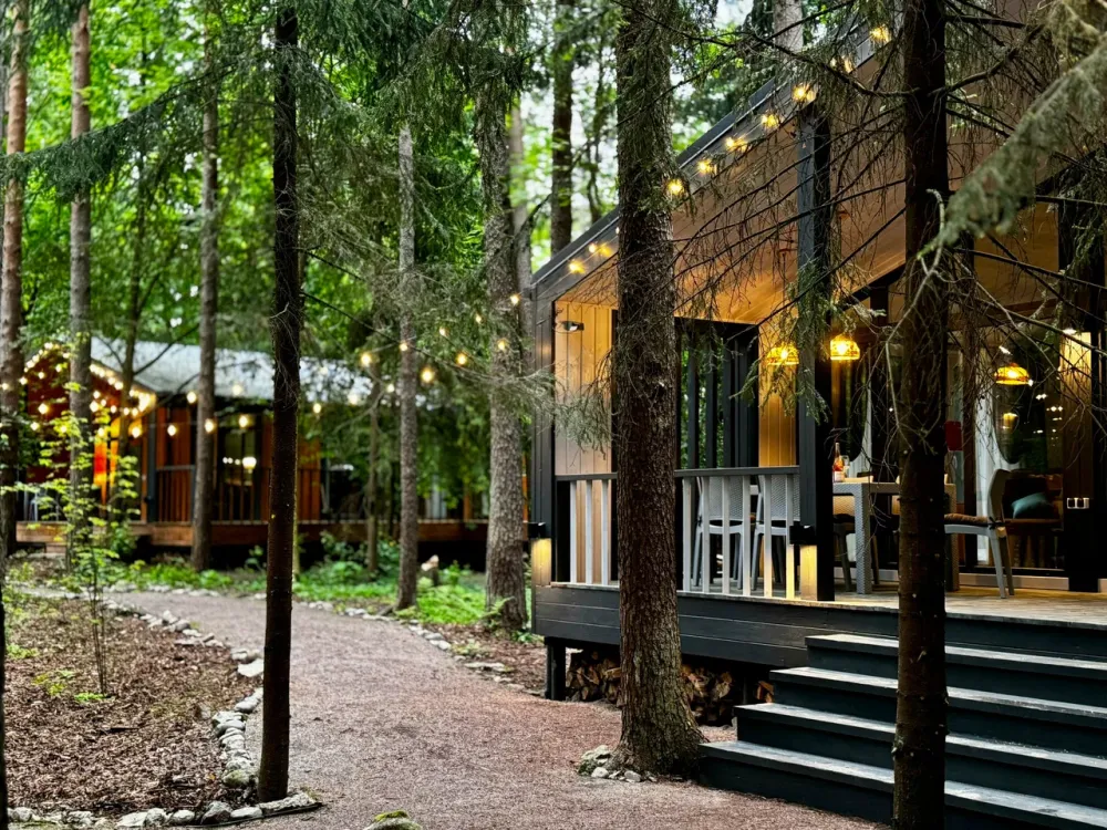 Тихое место среди сосен. Здесь можно проснуться под шелест веток, выпить кофе на террасе, прогуляться до залива и провести вечер у костра. Атмосфера уединения и отдыха без городской суеты.