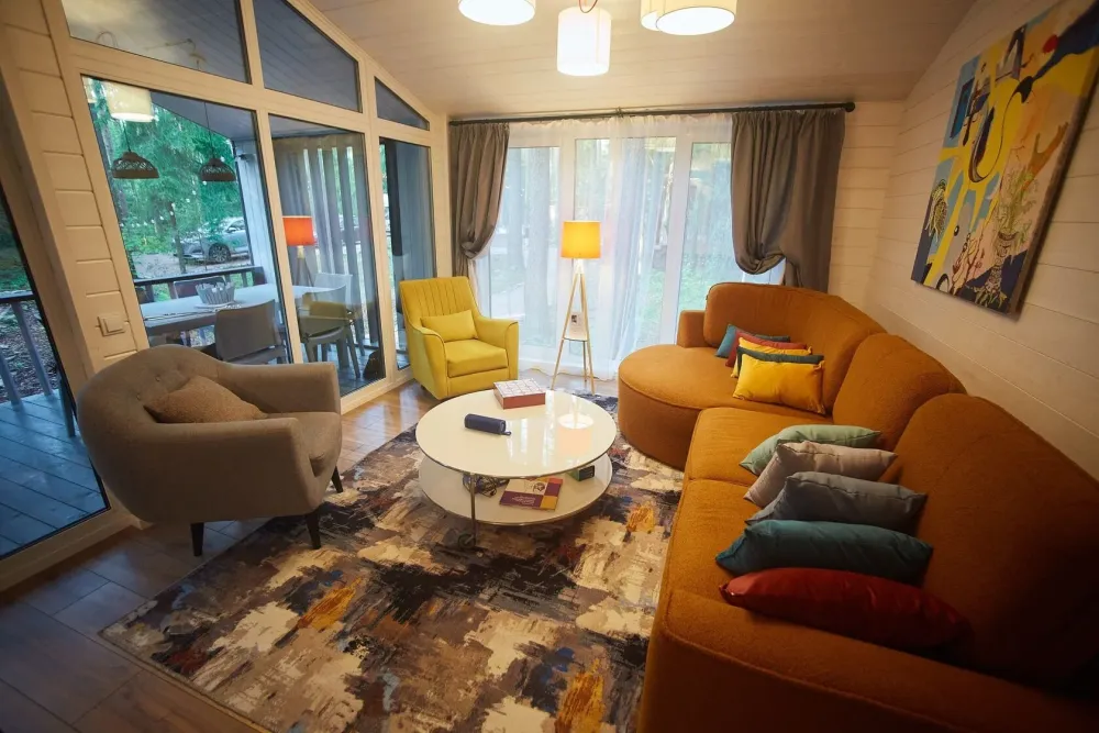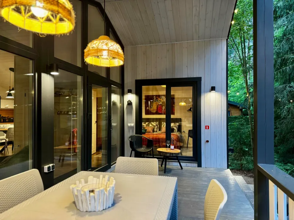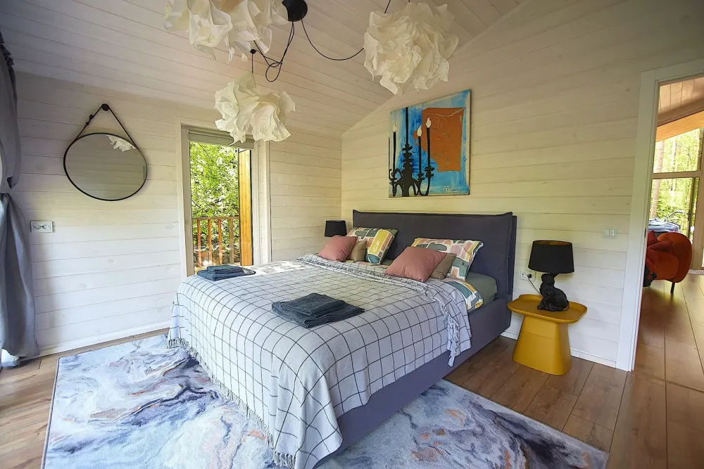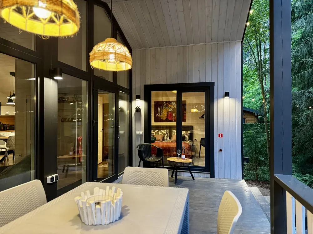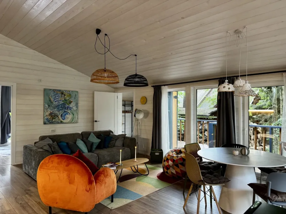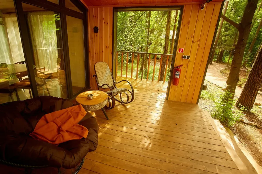 2 спальни, диван в гостиной, терраса с видом на лес