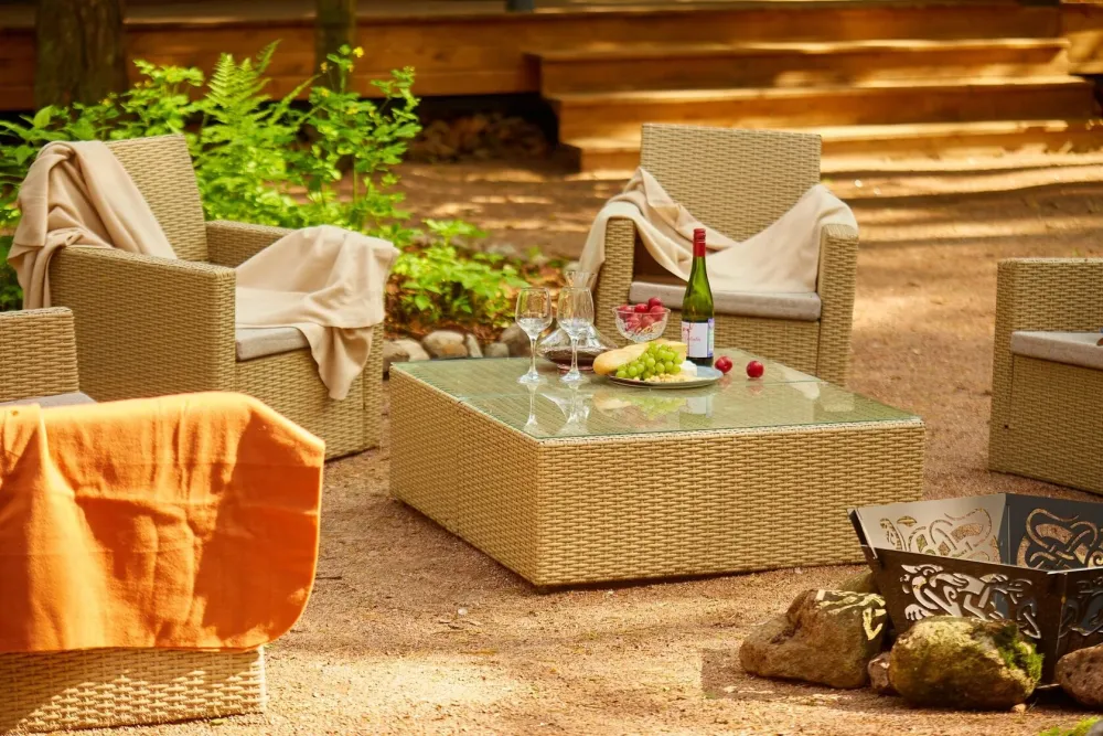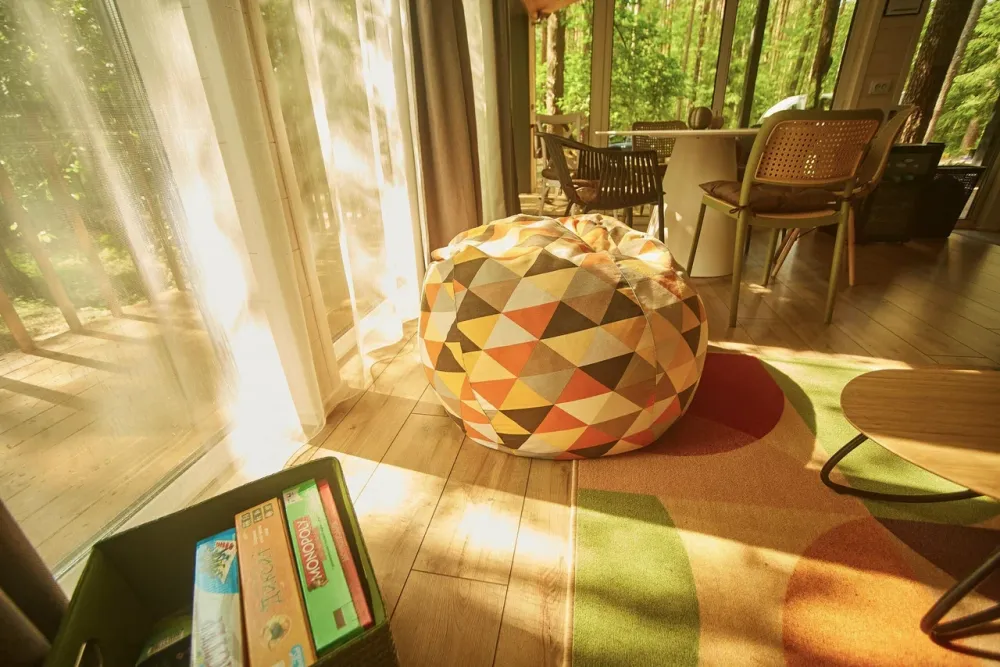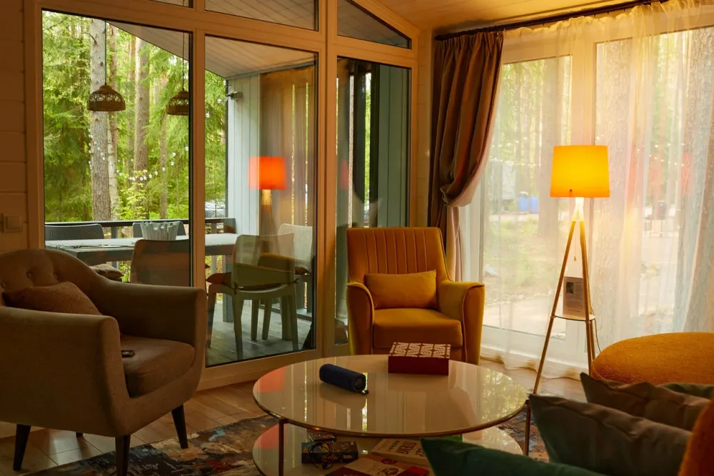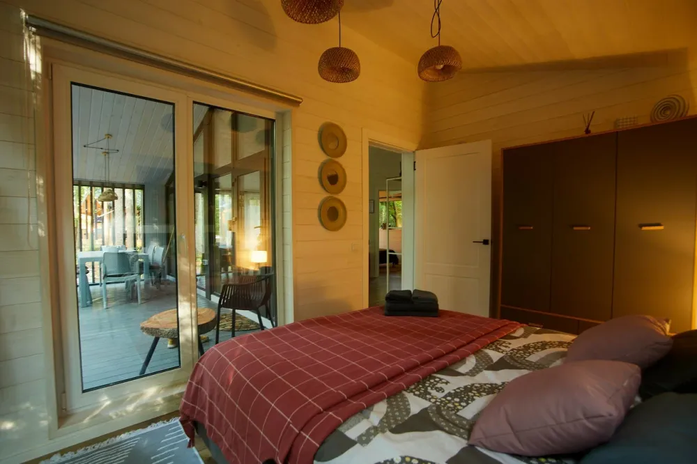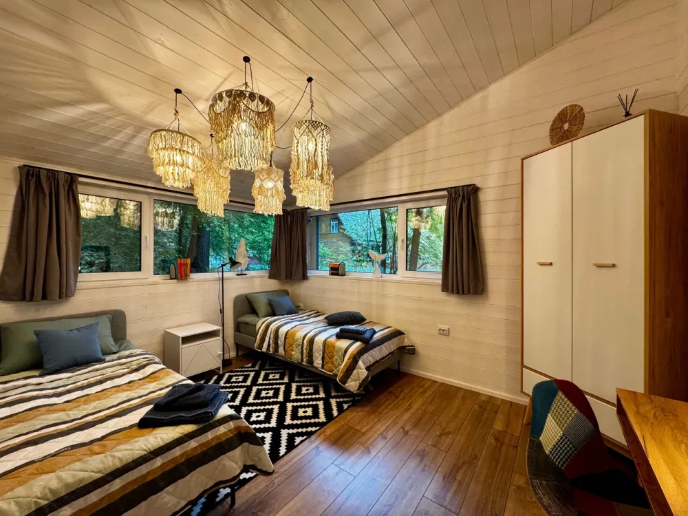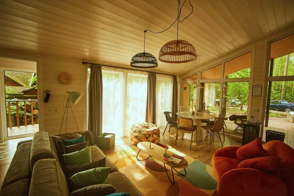 2 спальни, диван в гостиной, терраса с видом на лес
