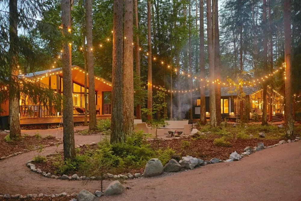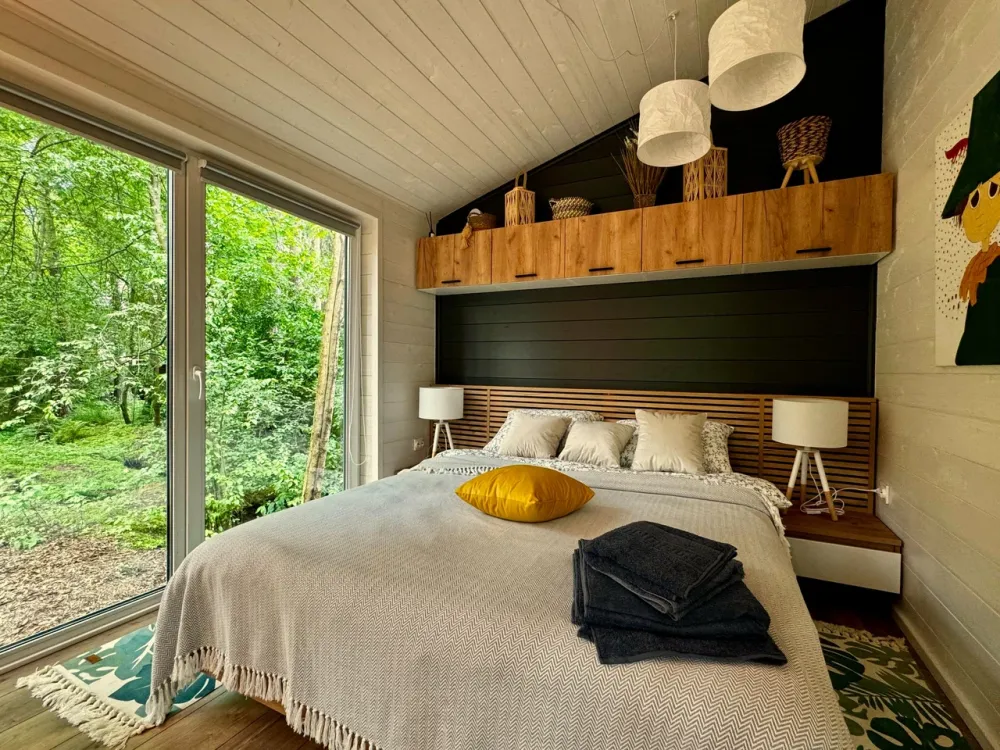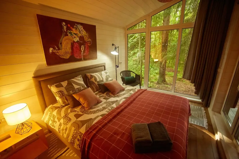 Оба дома — тёплые, круглогодичные, с видом на лес и закат.