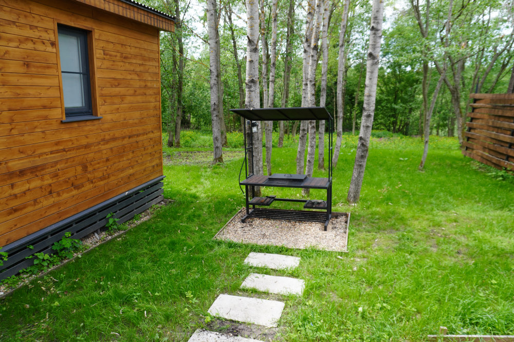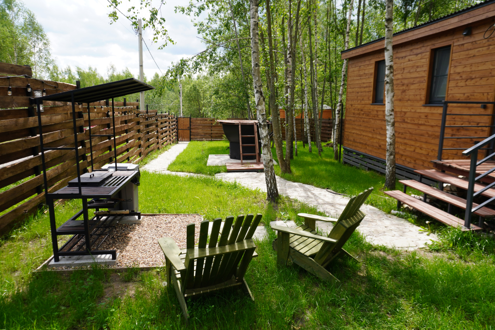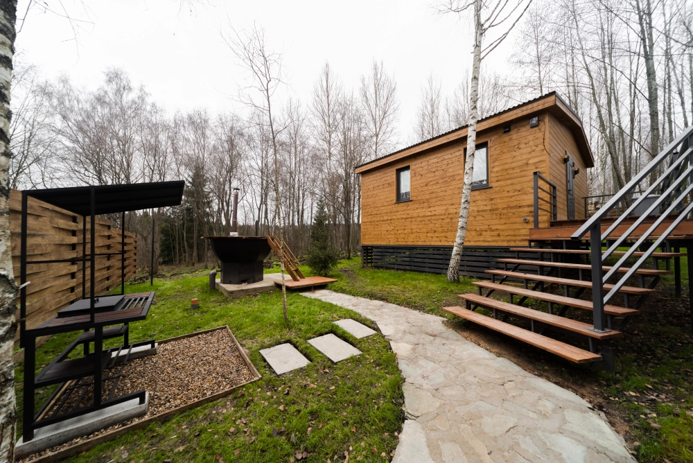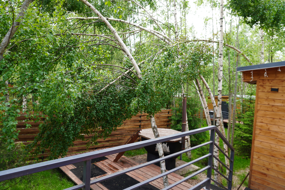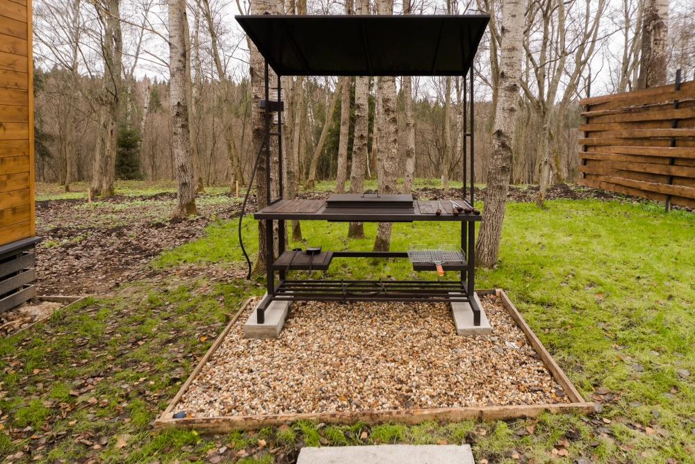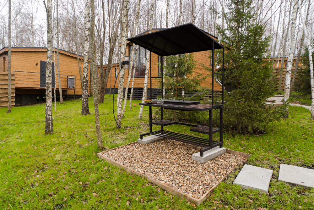 Мангальная зона есть около домиков БарнХаус Эко, БарнХаус Бохо, Дом-Баня с чаном , БарнХаус Эклектика, А-фрейм №1 с чаном и баней, А фрейм №2 с чаном и баней, БарнХаус Лофт, БарнХаус Бохо 2, БарнХаус Эклектика 2.