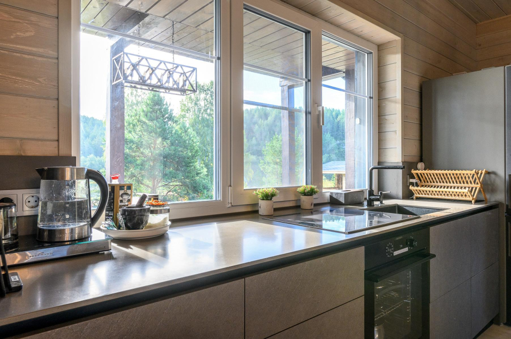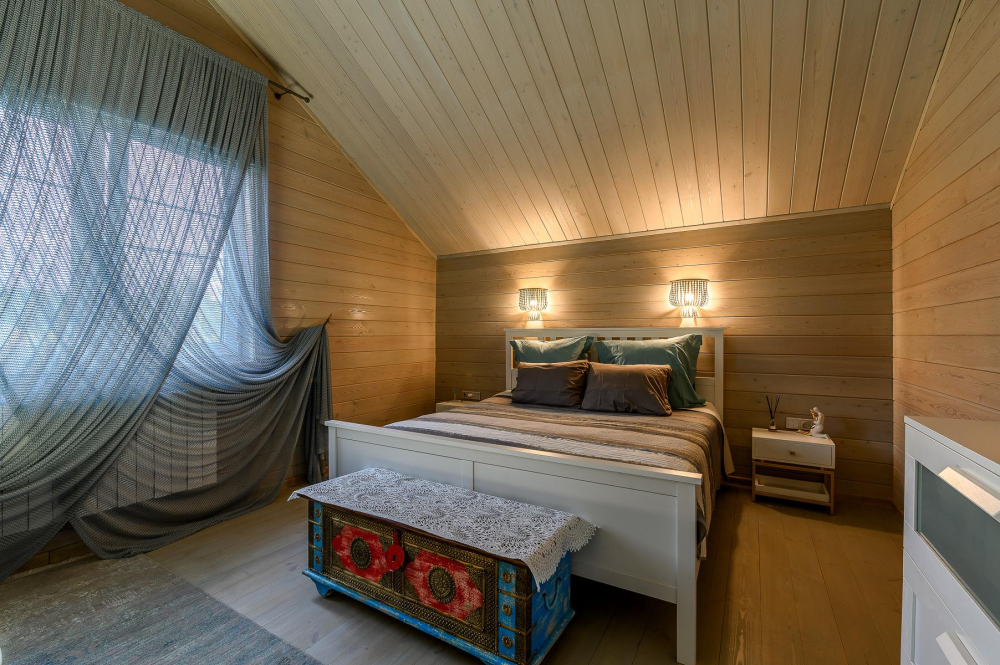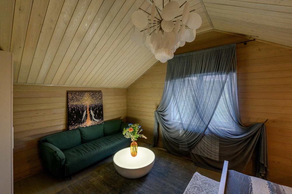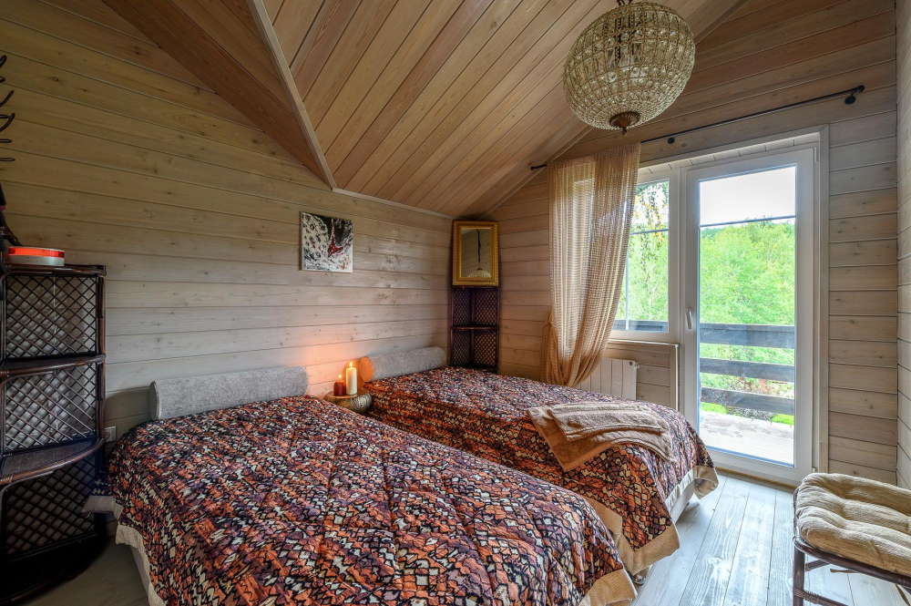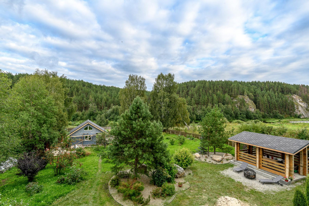 Есть баня с каменной печью из змеевика и зона для барбекю. Из уютных комнат открывается вид на реку, лес и горы, что создаёт атмосферу тишины и умиротворения.