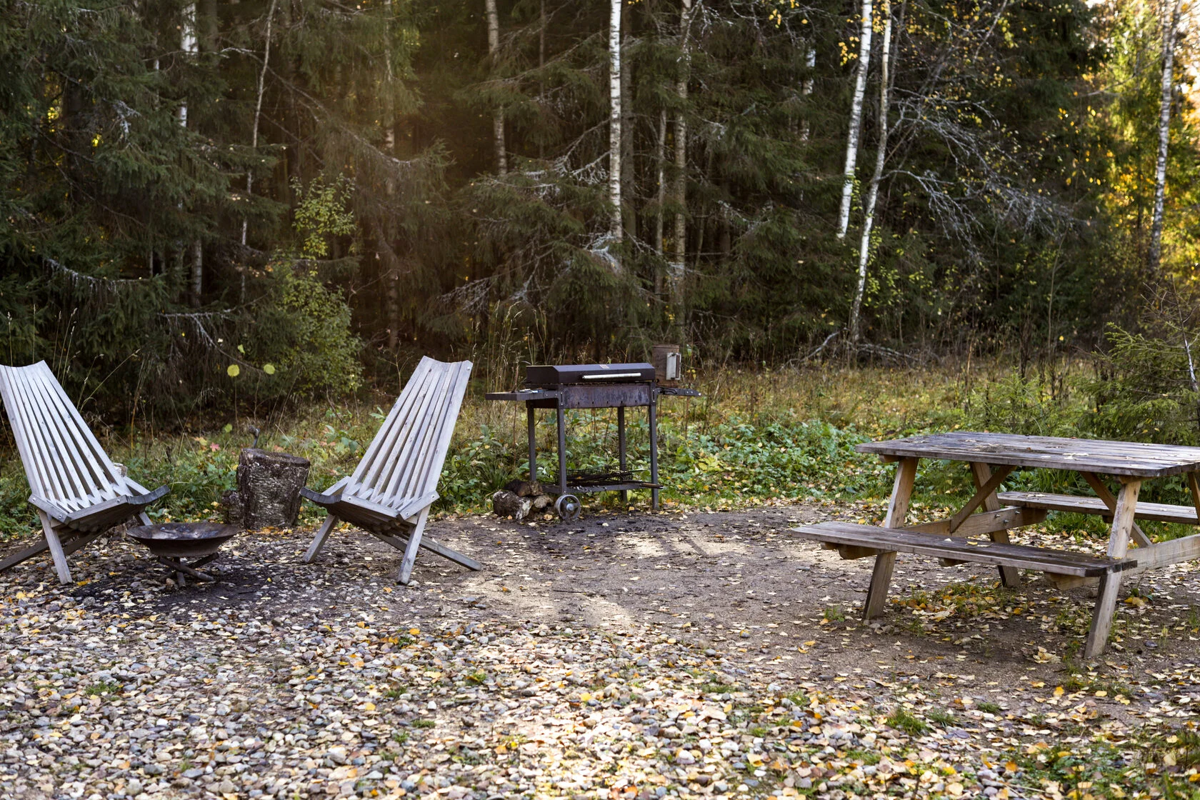 Перед каждым домиком есть оборудованная мангальная площадка и костровая зона с шезлонгами.