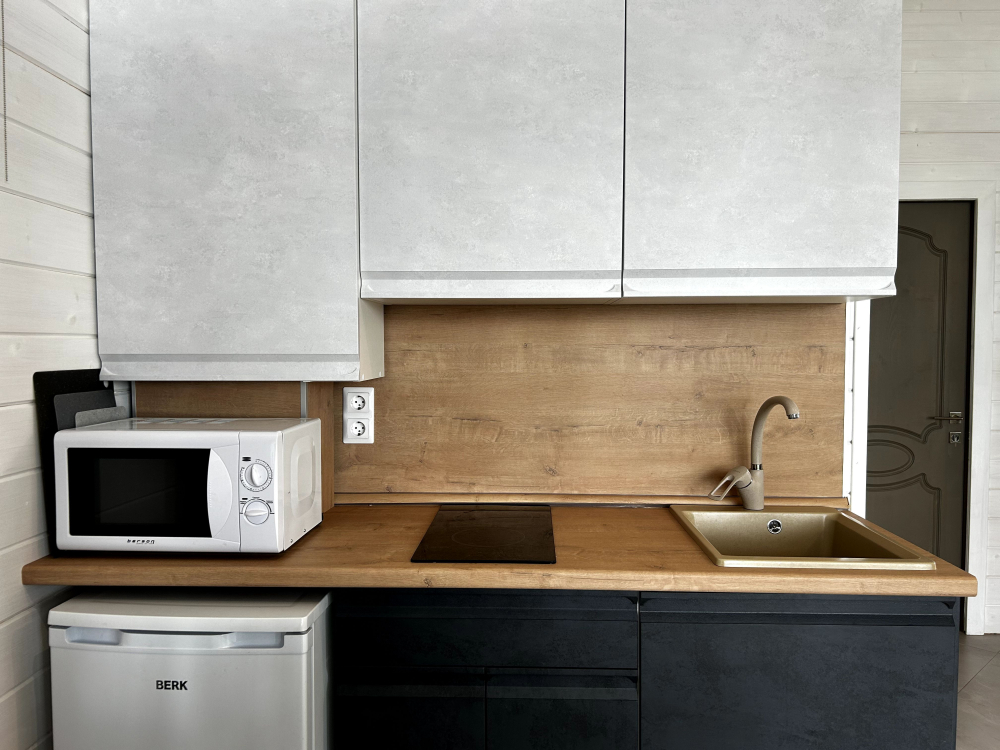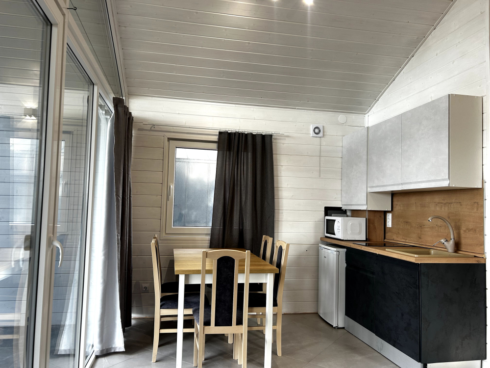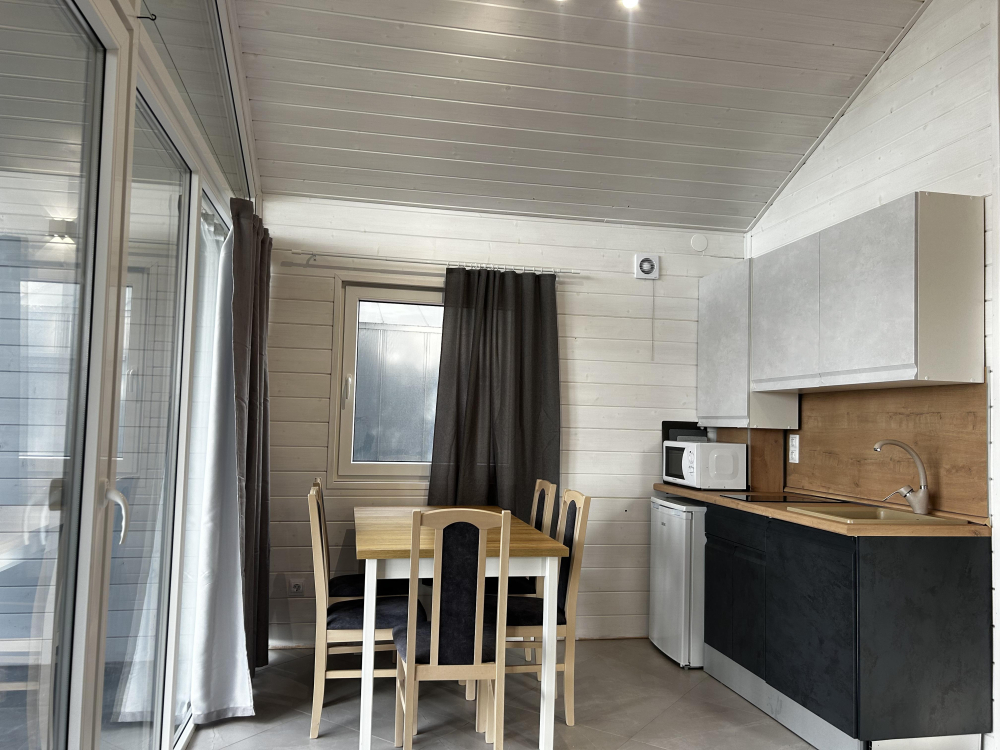 В каждом домике есть оборудованная кухня с посудой на 6 персон, газовой плитой, духовым шкафом, микроволновой печью, холодильником и чайником, что позволяет гостям готовить еду самостоятельно.