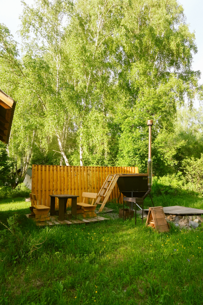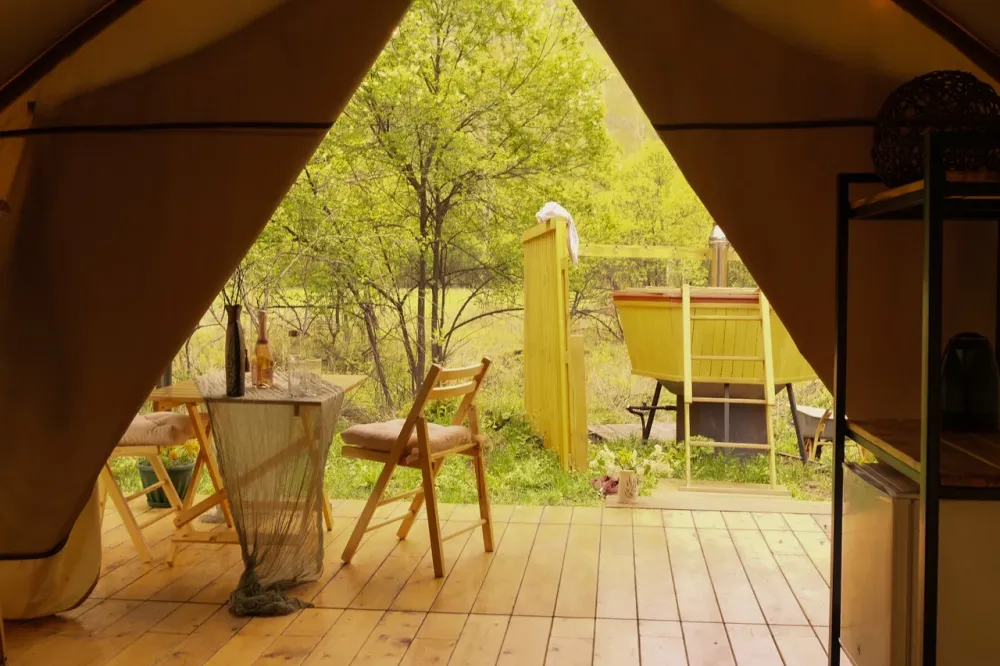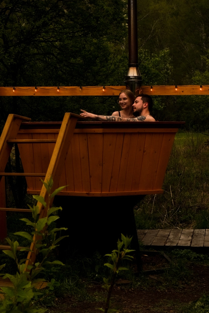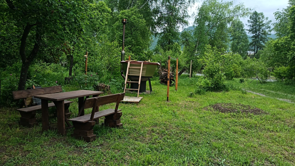 Особая гордость нашего глэмпинга — горячий чан с видом на горы и реку.