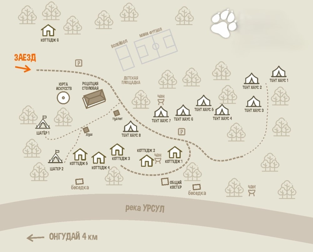 глемпинг находится на берегу реки Урсул, скорость течения реки 2 м/с, глубина 1 м, берег реки крутоват для спуска к воде. Места размещения расположены в от 30 до 100 м от реки.