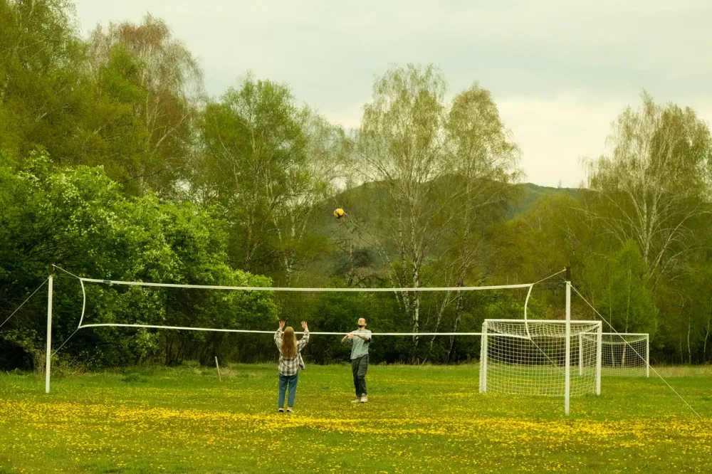 Поле для мини футбола, волейбольная площадка, мячи, набор для игры в бадминтон, качели.