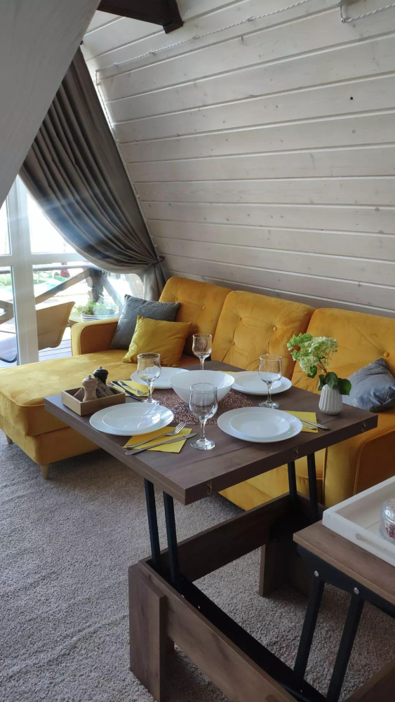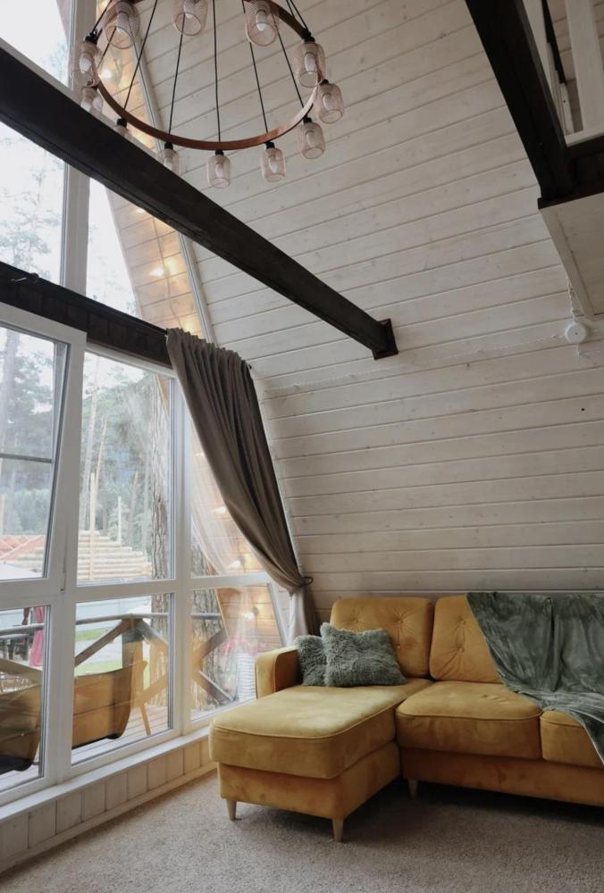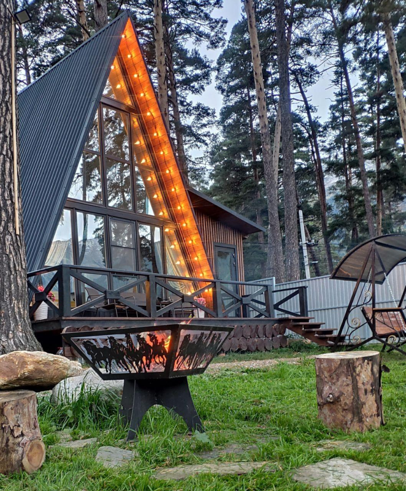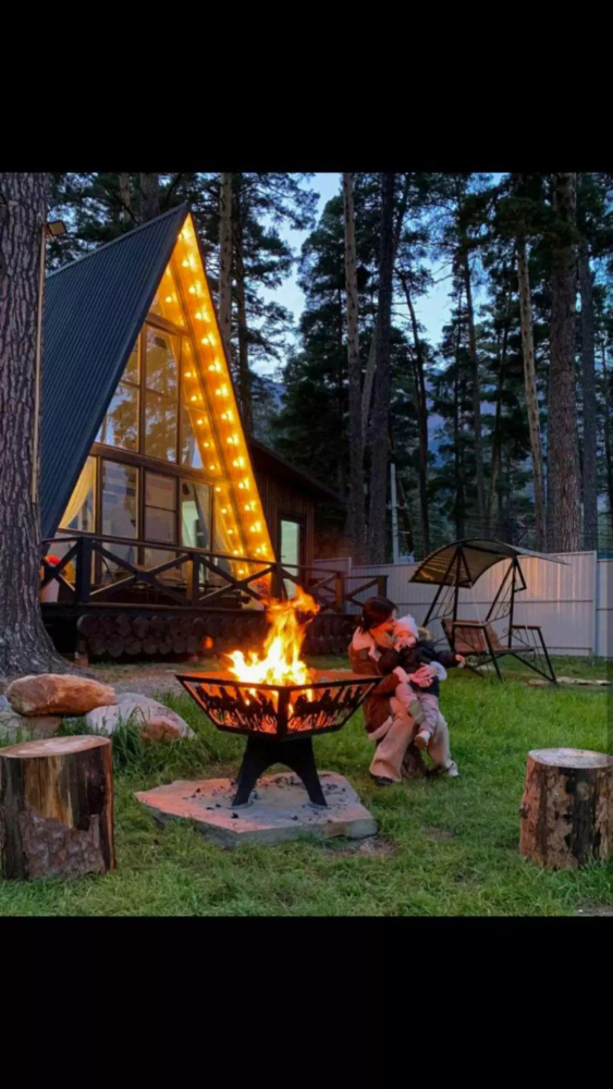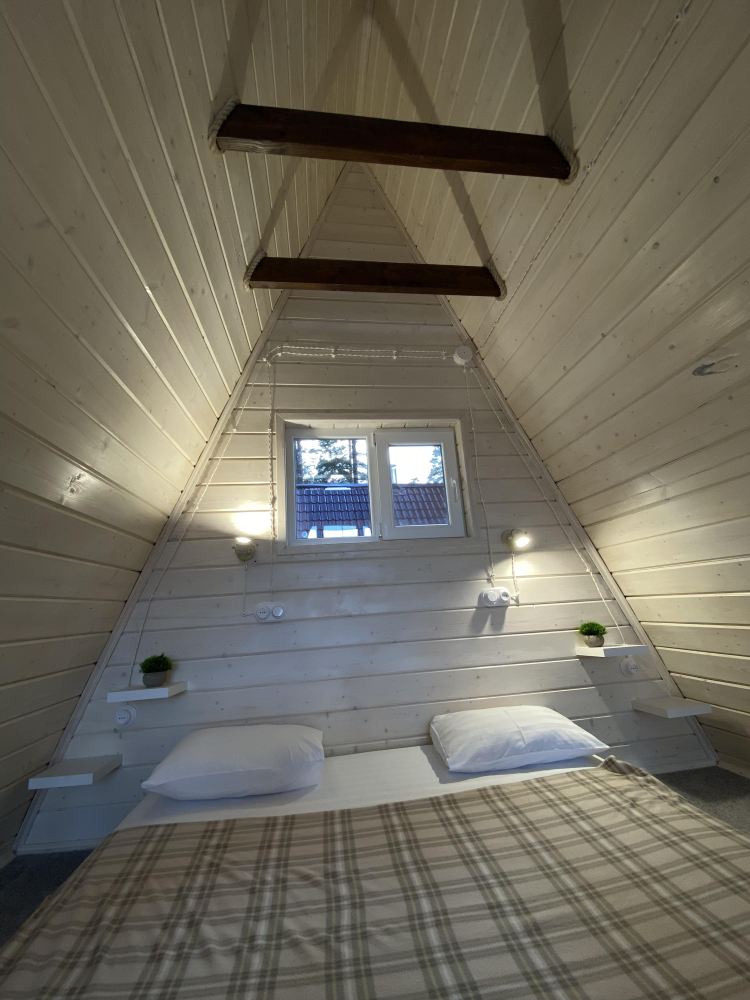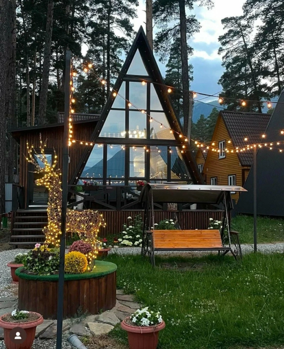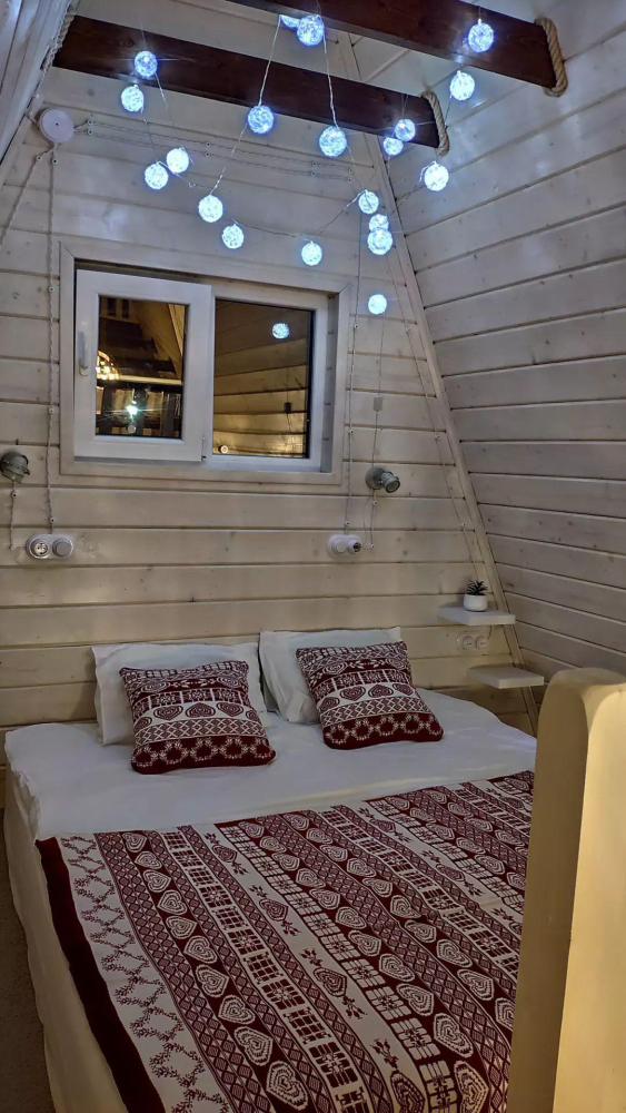 -Размещение : два комфортабельных деревянных дома А-frame с просторными комнатами и большими панорамными окнами обеспечивают прекрасный вид на природу.Дома полностью укомплектованы необходимой мебелью и техникой.