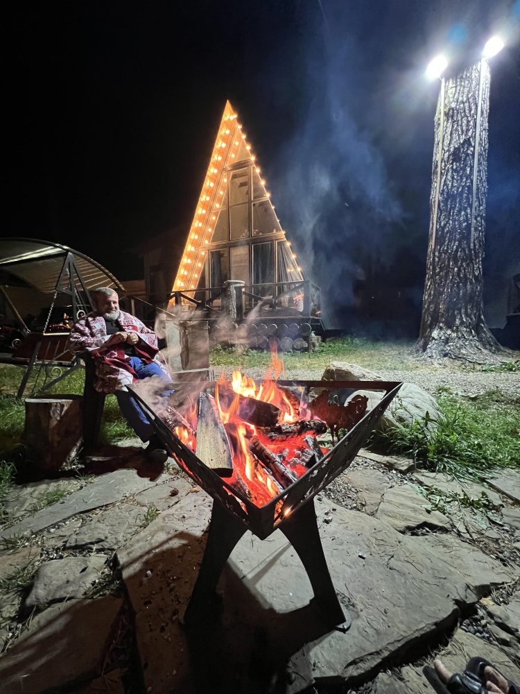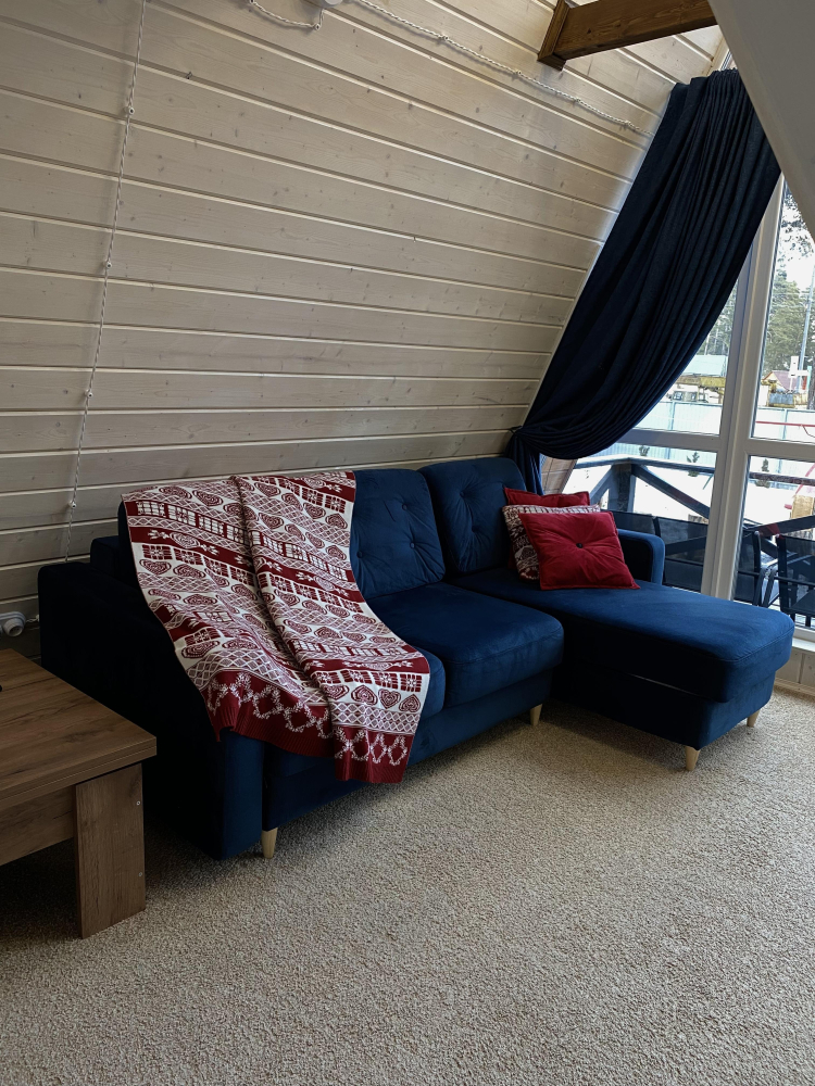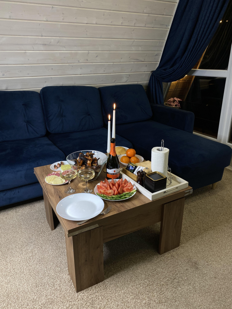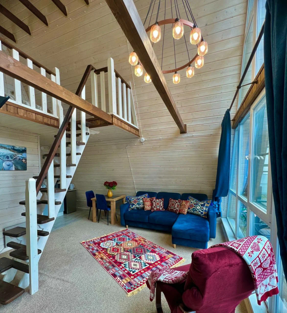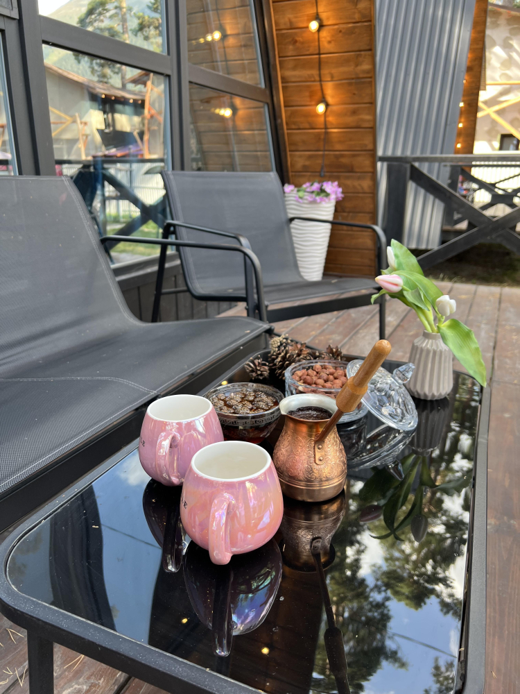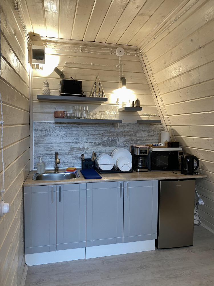 -Размещение : два комфортабельных деревянных дома А-frame с просторными комнатами и большими панорамными окнами обеспечивают прекрасный вид на природу.Дома полностью укомплектованы необходимой мебелью и техникой.