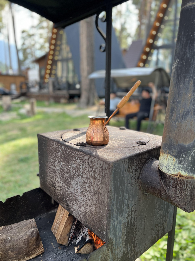 Есть зона для приготовления блюд на открытом огне. Решетки и шампуры предоставляются.