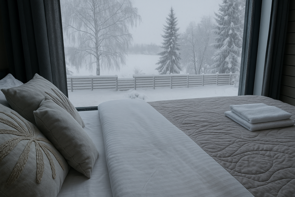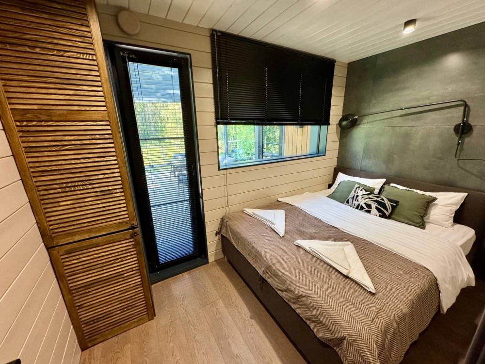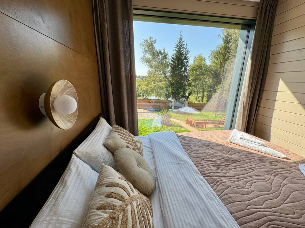 1-я спальня: кровать 160×200, панорамный вид на воду и лес