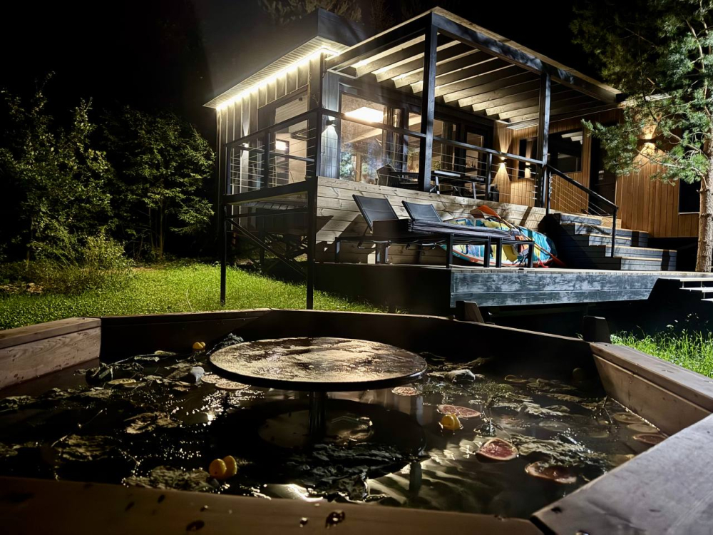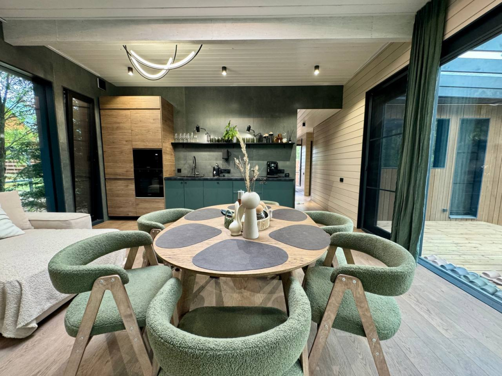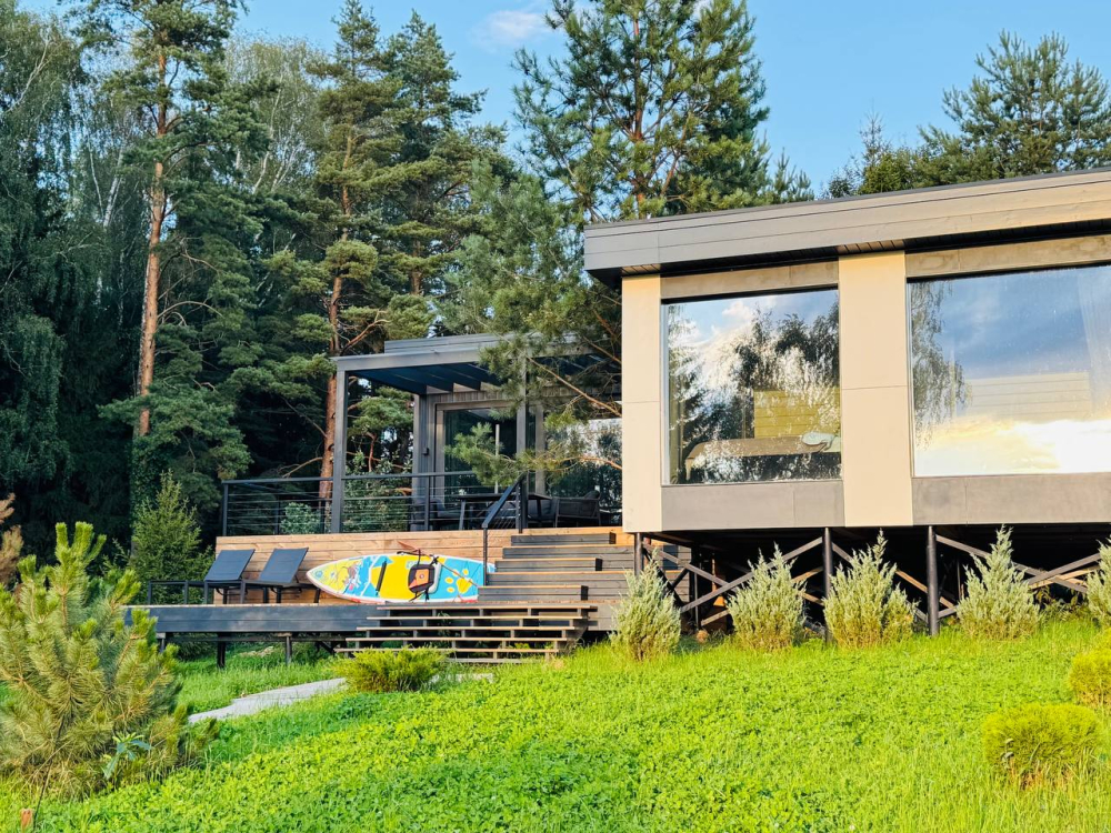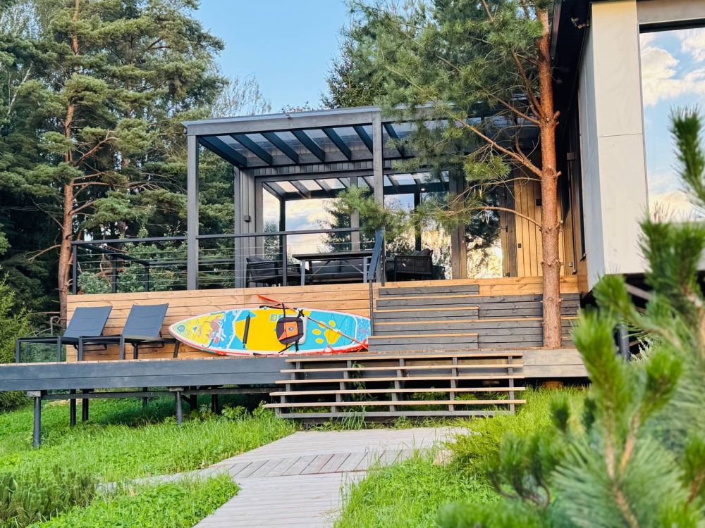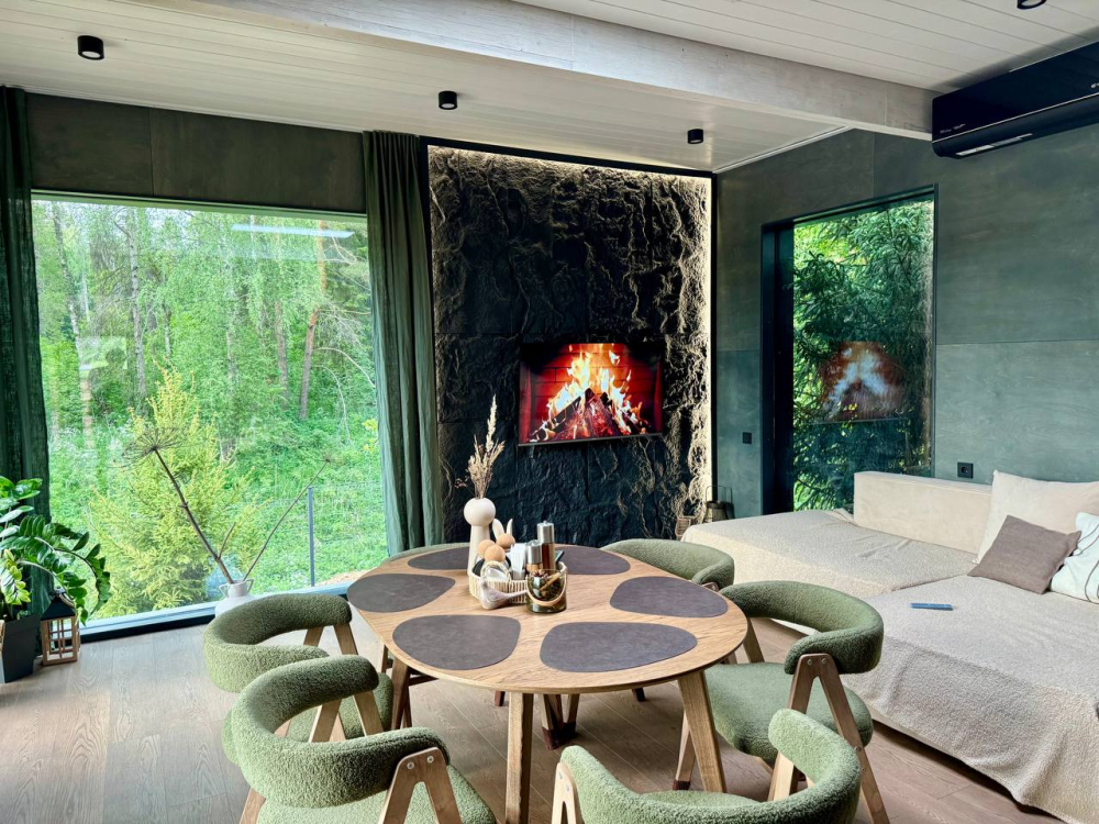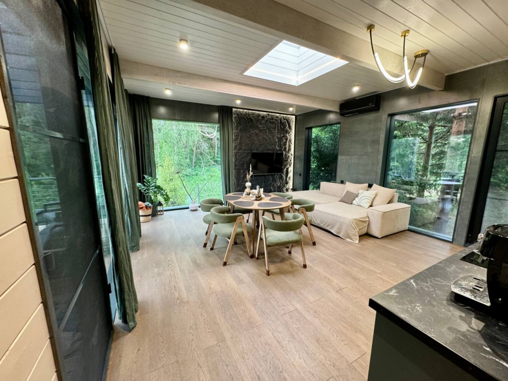 Современный дом для отдыха до 10 гостей. Панорамные окна, баня-сауна, просторная гостиная, уединение у воды и леса.