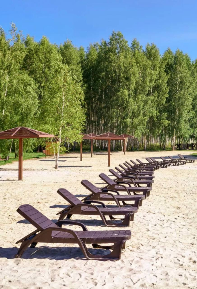 Озеро с песчаным пляжем, лежаками и BBQ-зонами