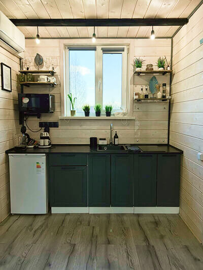 Полноценная кухня: плита, СВЧ-печь, чайник, холодильник