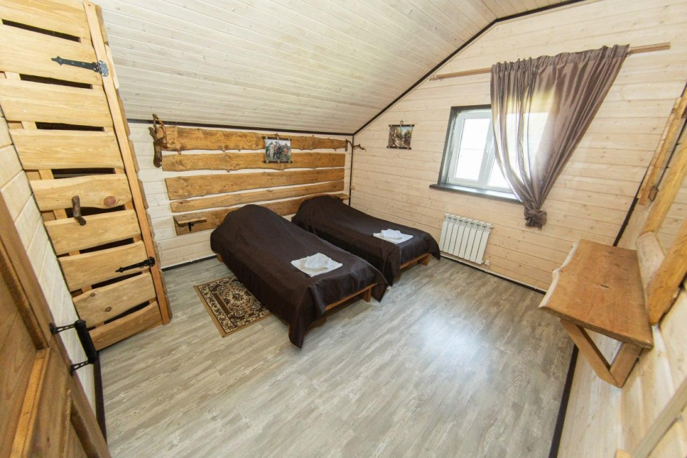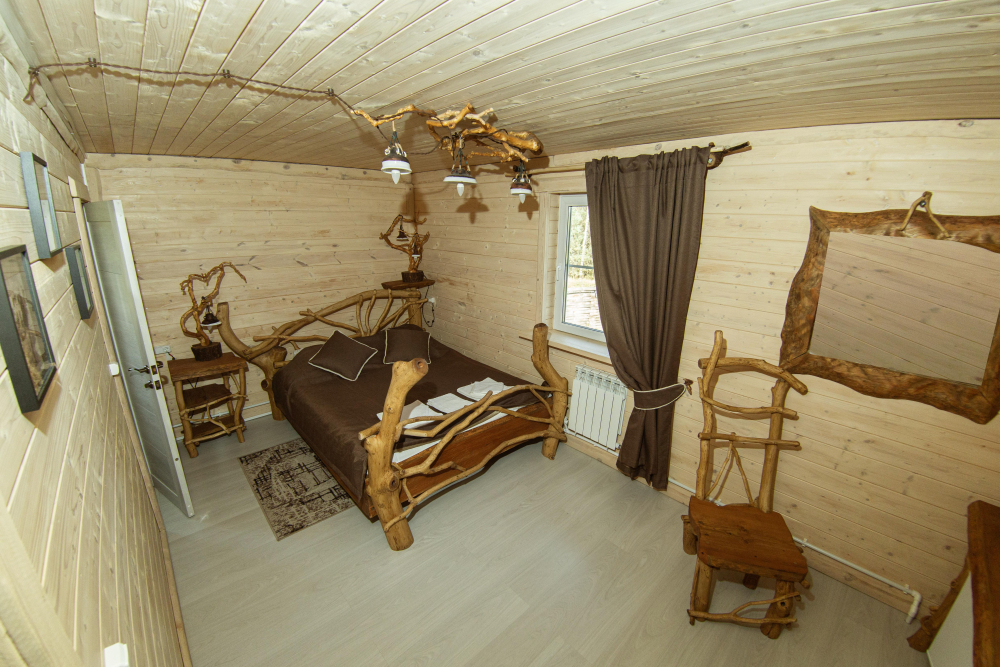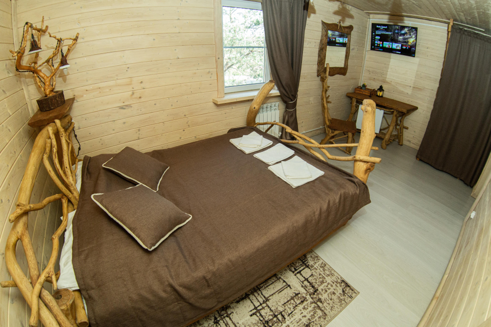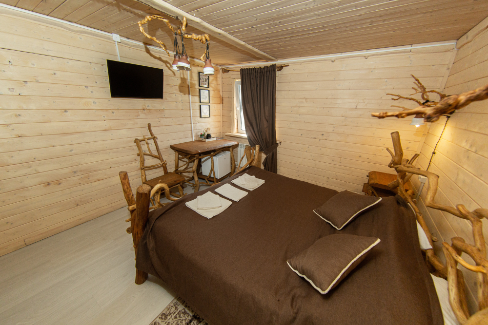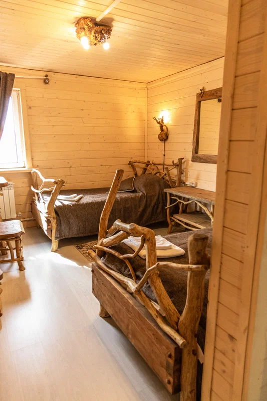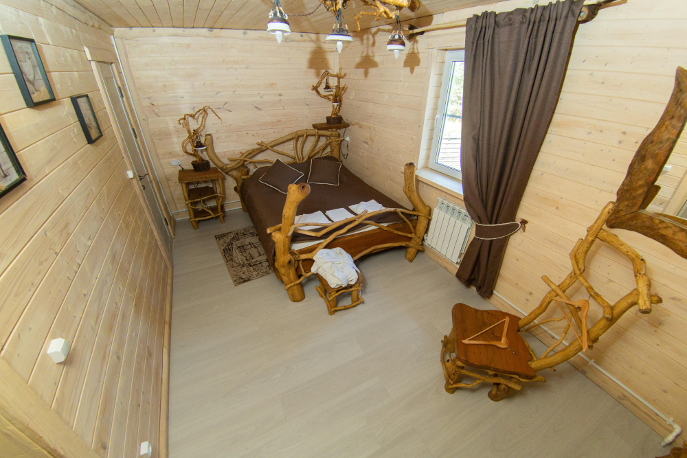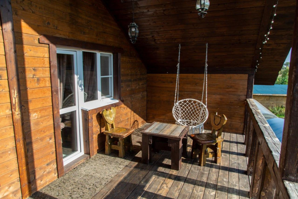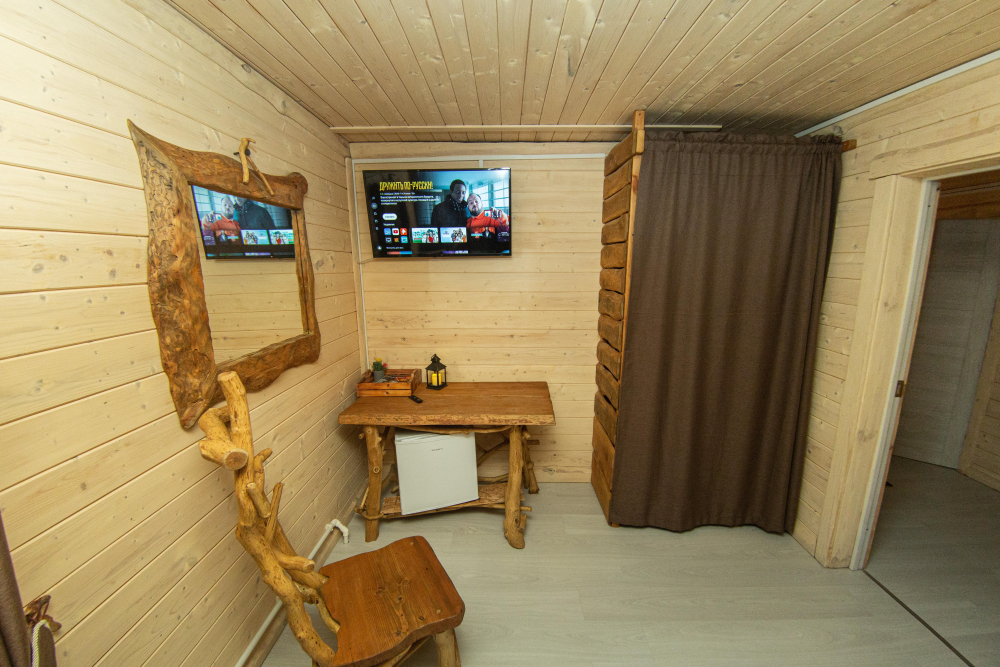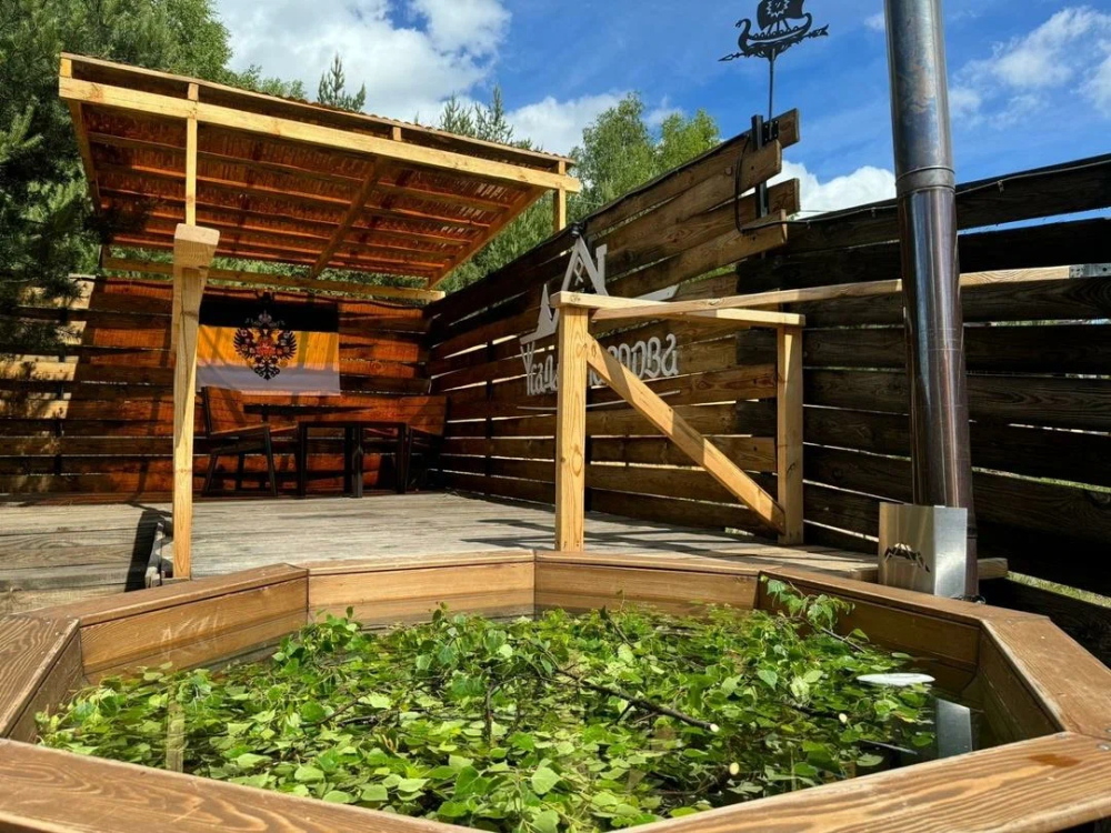 Комплекс включает в себя современную парную на 600 кг камня, санузел, душевую с обливным механизмом, просторную столовую, кухню, мангал, подвесную кровать с матрасом на сене и чан на дровах. Банный комплекс рассчитан на 10 человек, чан – на 6.
