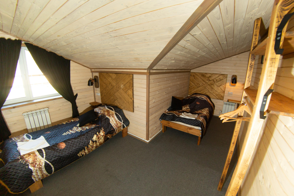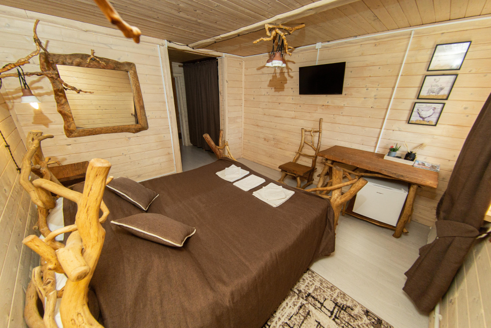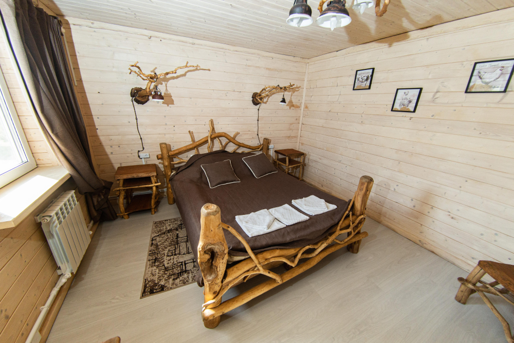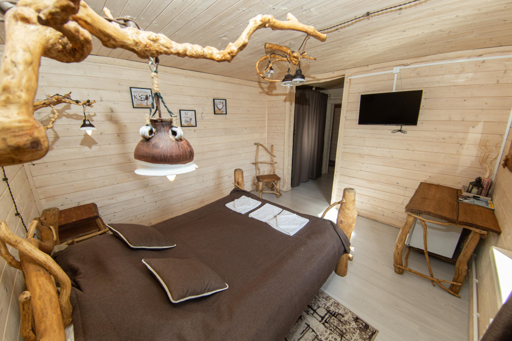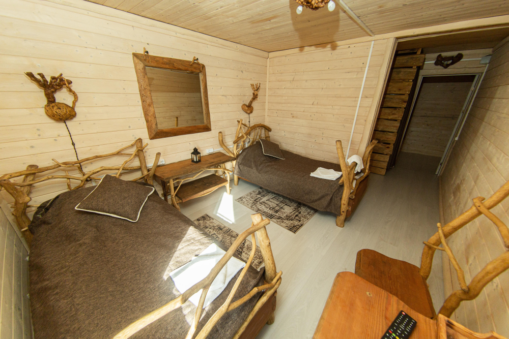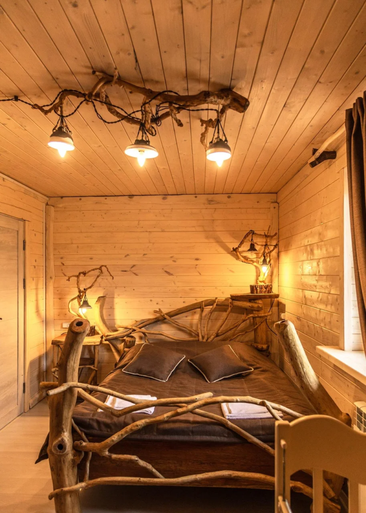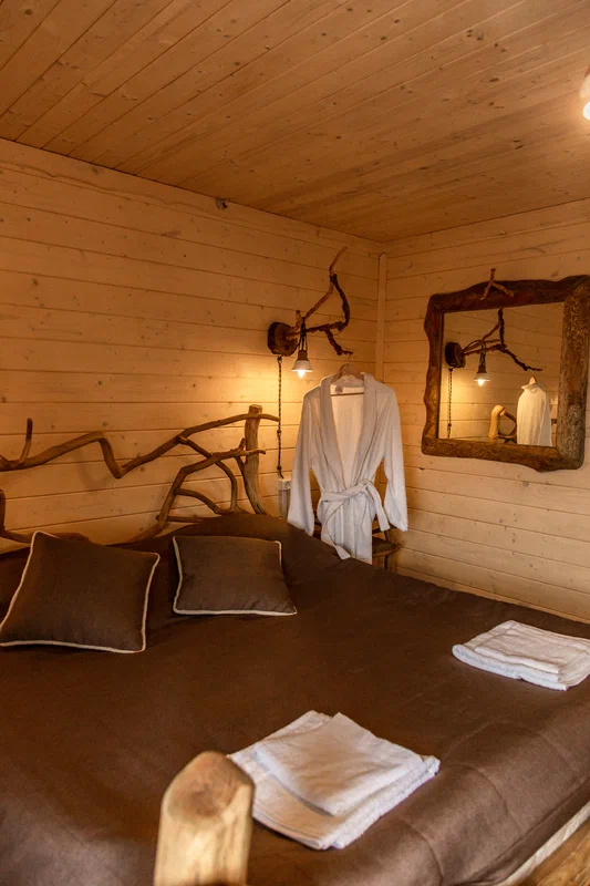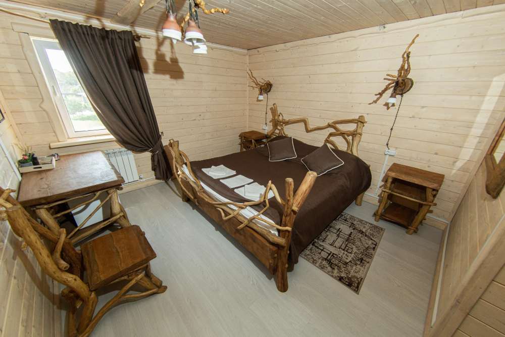 Комплекс включает в себя современную парную на 600 кг камня, санузел, душевую с обливным механизмом, просторную столовую, кухню, мангал, подвесную кровать с матрасом на сене и чан на дровах. Банный комплекс рассчитан на 10 человек, чан – на 6.