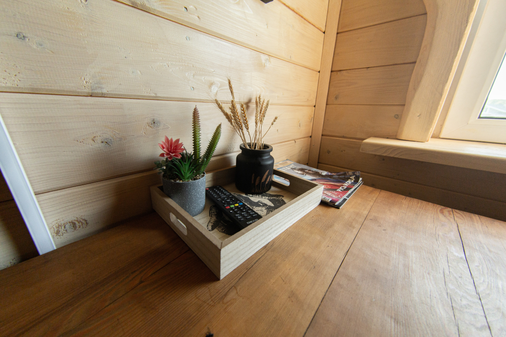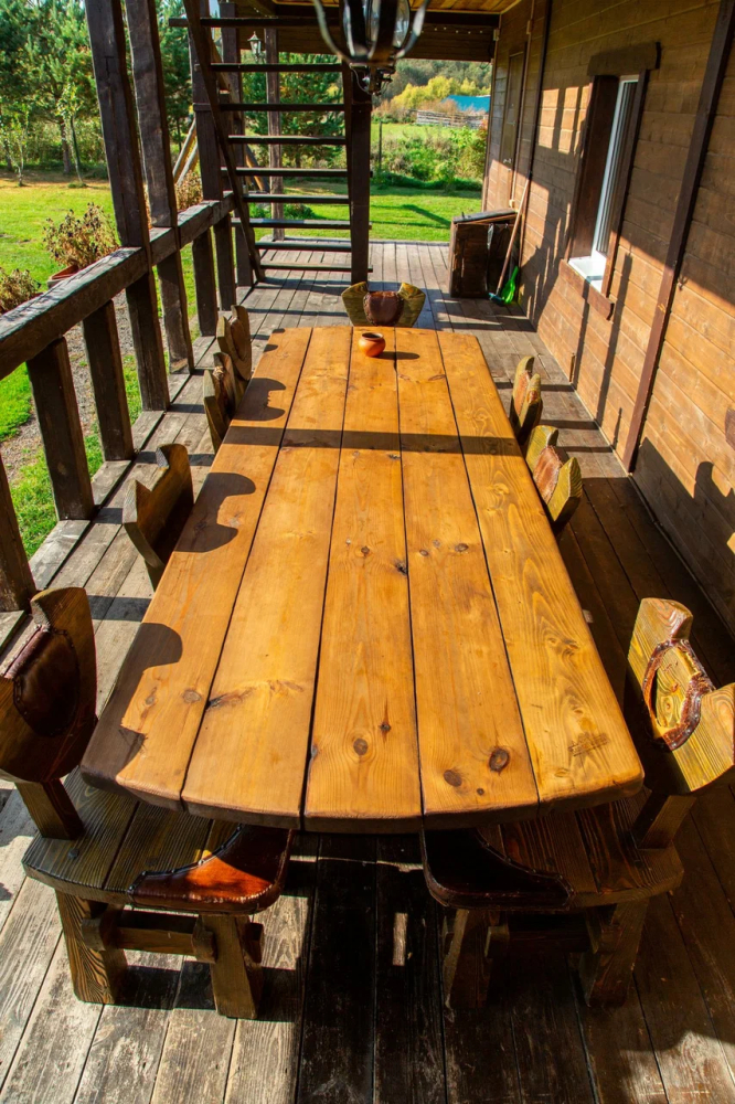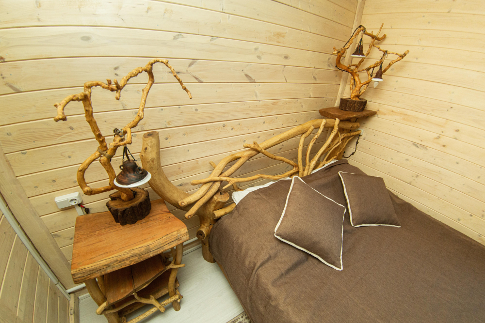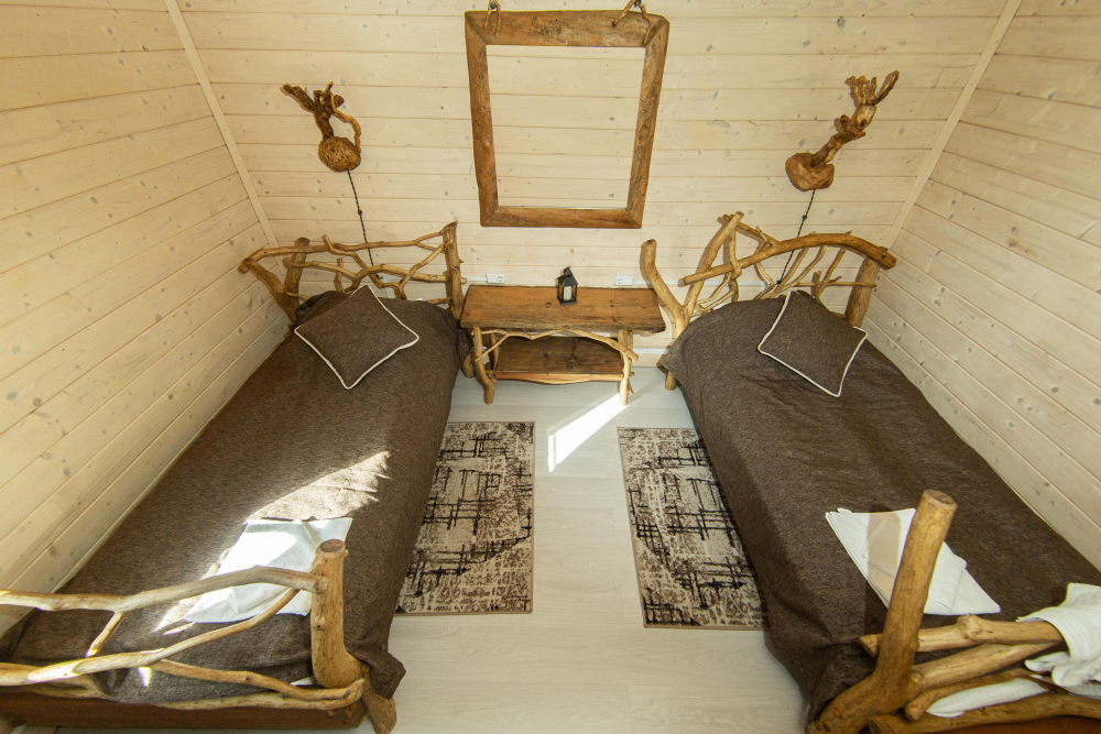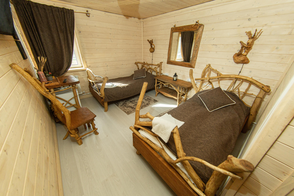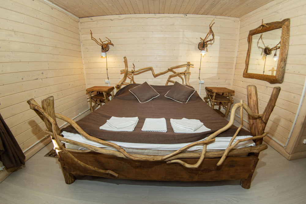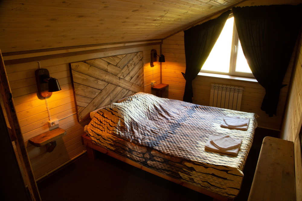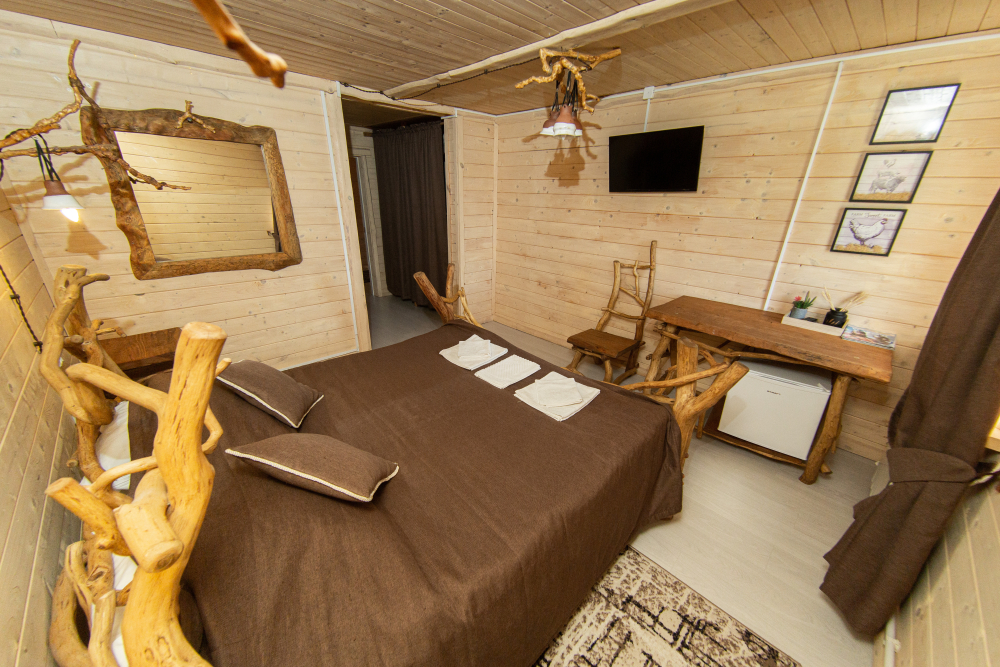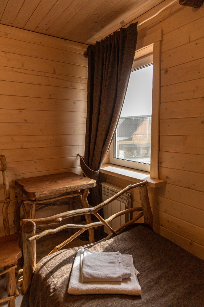 Комплекс включает в себя современную парную на 600 кг камня, санузел, душевую с обливным механизмом, просторную столовую, кухню, мангал, подвесную кровать с матрасом на сене и чан на дровах. Банный комплекс рассчитан на 10 человек, чан – на 6.